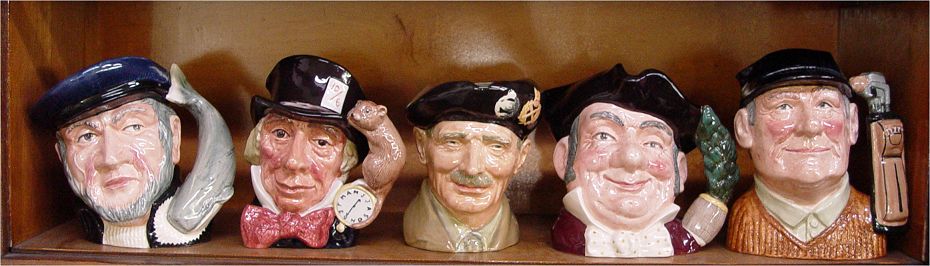 ROYAL DOULTON LARGE CHARACTER JUGS: To include, CAPT AHAB, D 6500, 1958; GOLFER (1st Version), D 6623, 1970; MAD HATTER, D 6598, 1964; MONTY, (possibly D 6202) and MINE HOST, D 6468, 1957. Sold as a lot.