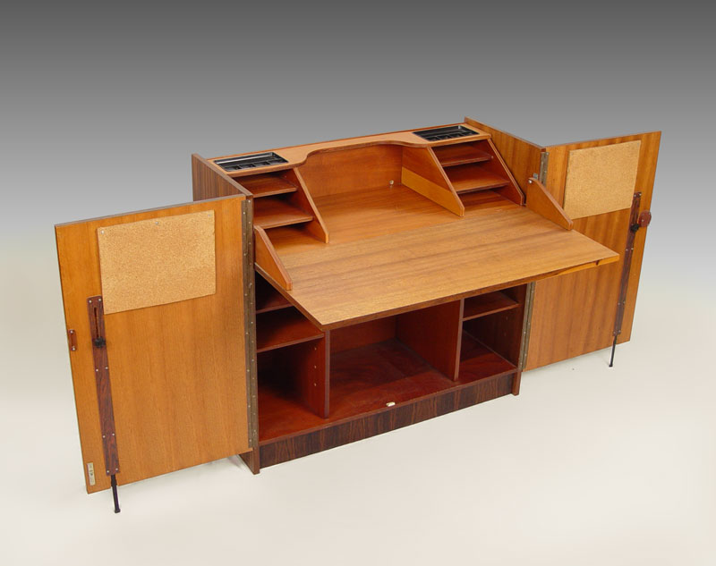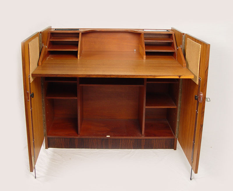 VINTAGE ROSEWOOD MID CENTURY DESK MADE IN BRAZIL: Looks like a credenza, the front doors open, the top flips and there is a desk. Stamped Brasil Gritsch. 45''h. x 35 1/2'' x 15''.