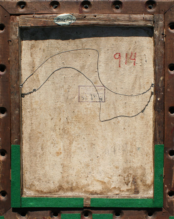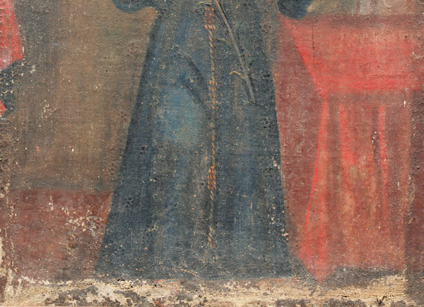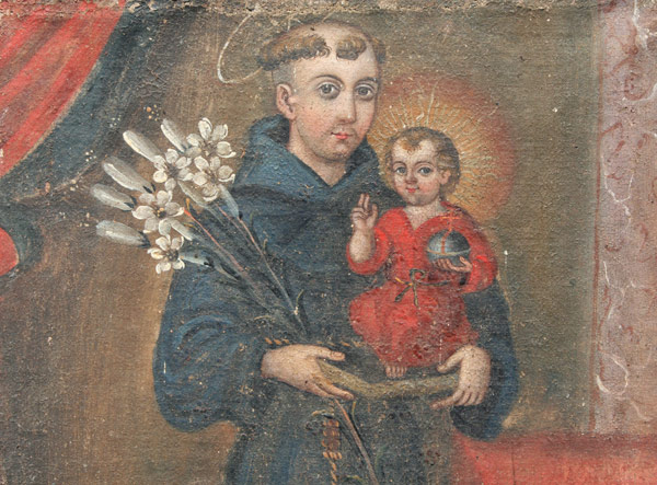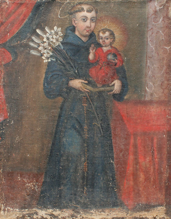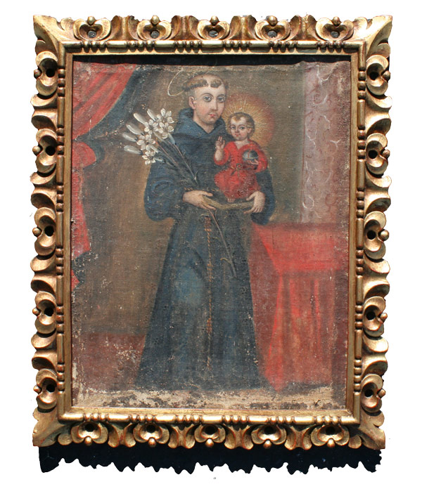 SOUTH AMERICAN SAINT WITH BABY JESUS. Oil/Canvas, 16 1/2'' x 13'', carved and gilded frame, 19 1/2'' x 16''. From the collection of former US Diplomat and State Department official John E. Karkashian.