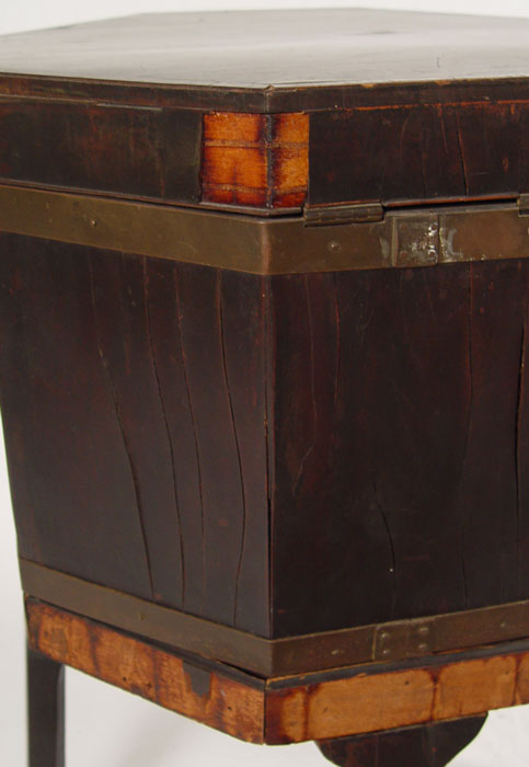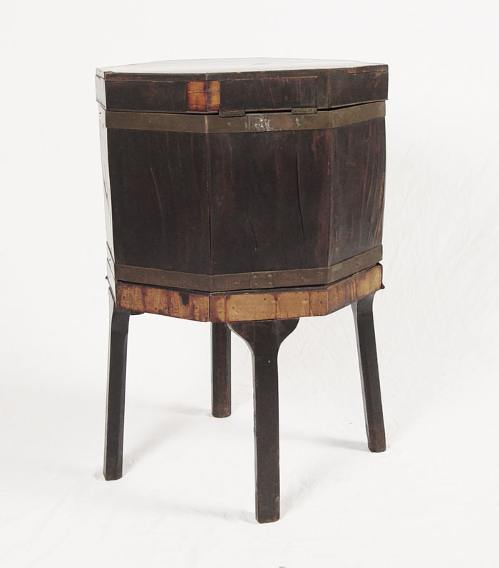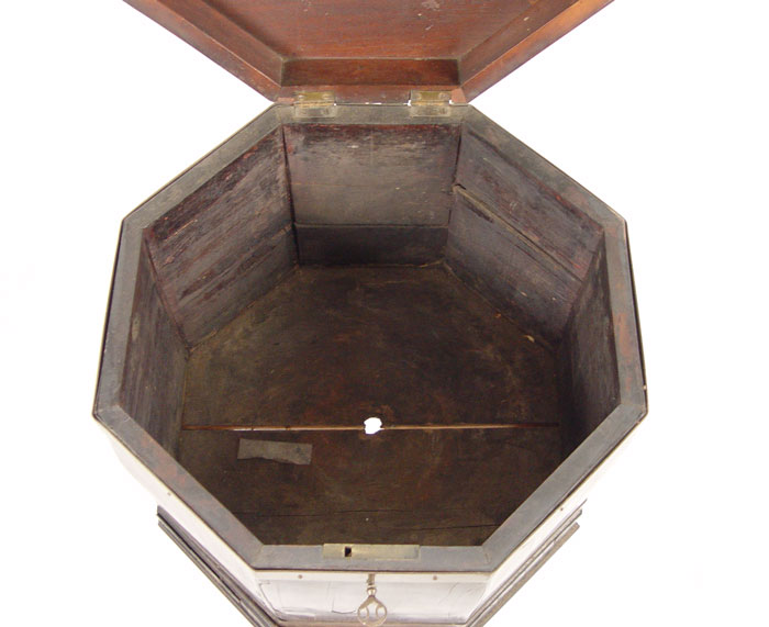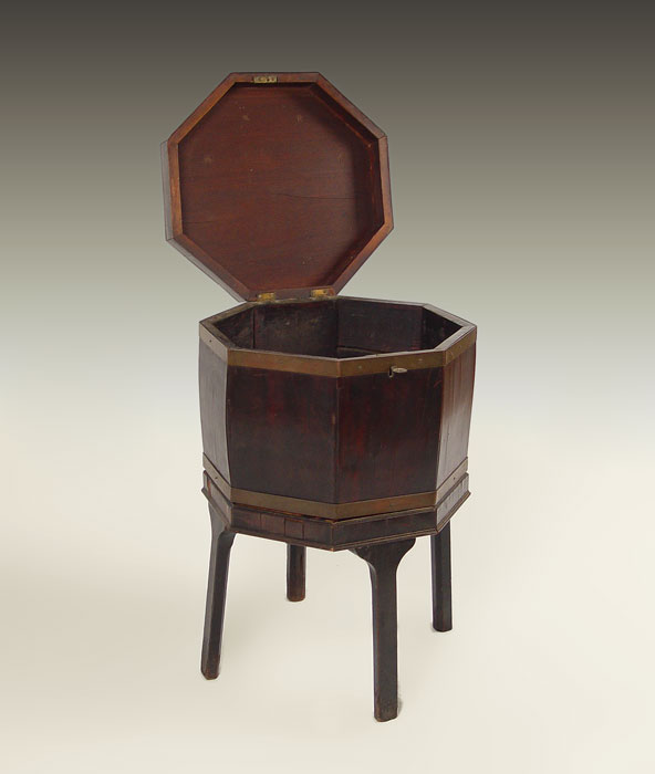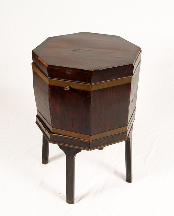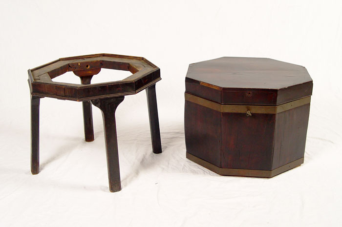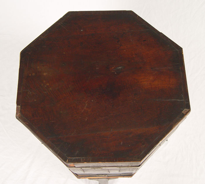 EARLY 19th C CELLERETTE: Mahogany veneer, octagonal shape. Rests on base of 4 straight legs. 28'' tall a 17'' dia.