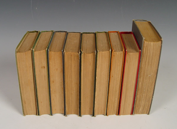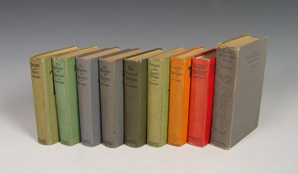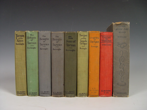 8 EDGAR RICE BURROUGHS TARZAN BOOKS: To include, ''Tarzan of the Apes'', copyright A.C. McClurg & Co 1914, published by A.L. Burt Company New York, June 1914, popped spine, tear on pg 111; ''The Return of Tarzan'', decorations by J. Allen St. John, copyright A.C. McClurg & Co 1915, published March 1915, popped spine, bottom corners missing on a several pages; two copies of ''The Beast of Tarzan'', illustrations by J. Allen St. John, copyright A.C.McClurg 1916, published A.L. Burt Co. March 1916, one with popped spine; ''The Son of Tarzan'', illustrations by J. Allen St. John, copyright A.C. McClurg March 1917 published A.L.Burt 1918; ''Tarzan and the Jewels of Opar'', copyright A.C. McClurg & Co 1918, published A.L. Burt April 1918, title page detached; ''Jungle Tales of Tarzan'', copyright Edgar Rice Burroughs 1919, published A.C. McClurg March 1919, popped spine; and ''Tarzan the Terrible'', copyright Edgar Rice Burroughs 1921, published A.C. McClurg June 1921, popped spine. Sold with a 1938 edition of Margaret Mitchell's Gone with the Wind.