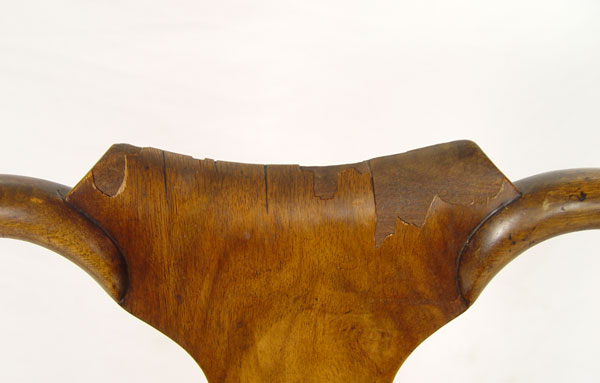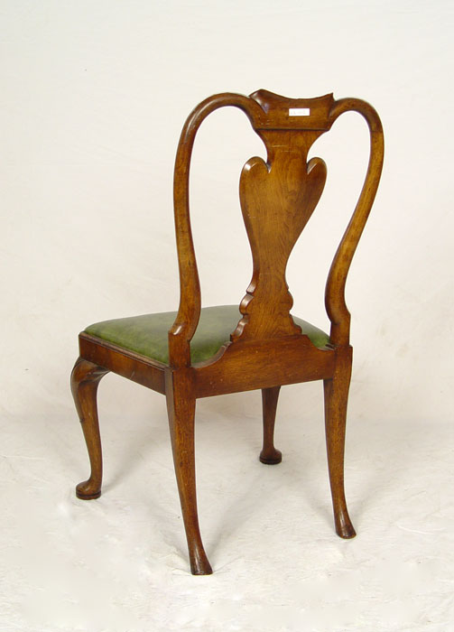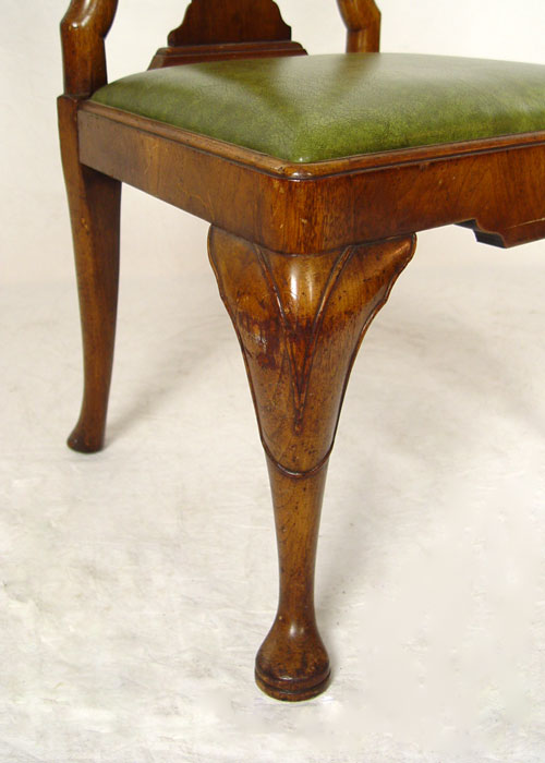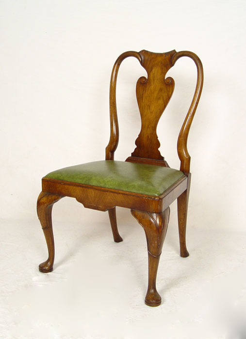 QUEEN ANNE WALNUT DESK CHAIR: Green leather seat. Queen Anne leg with pad foot. 24'' wide, 22'' deep, 37'' tall.
