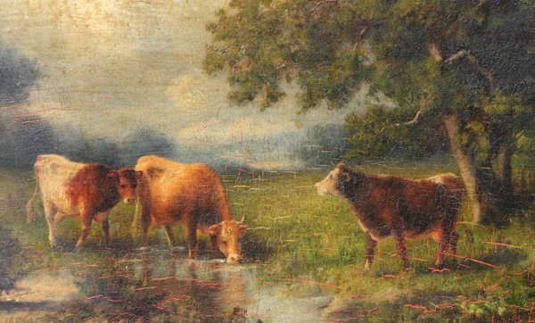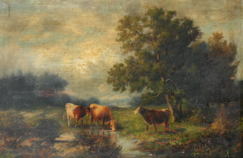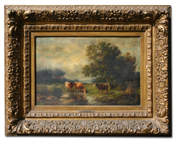 EXCEPTIONAL PAINTING OF COWS IN A LANDSCAPE: OIL/Board, 15'' x 22'', signed, superior gilded and carved frame with wear and repair, 28'' x 35''.
