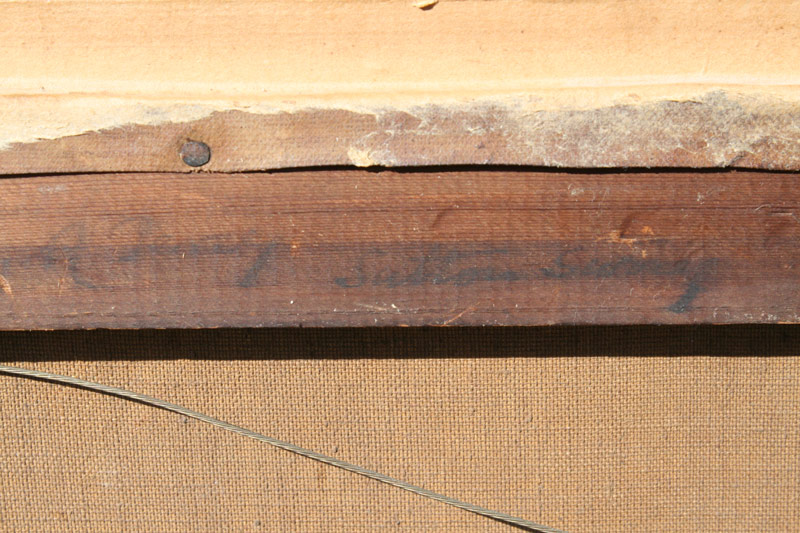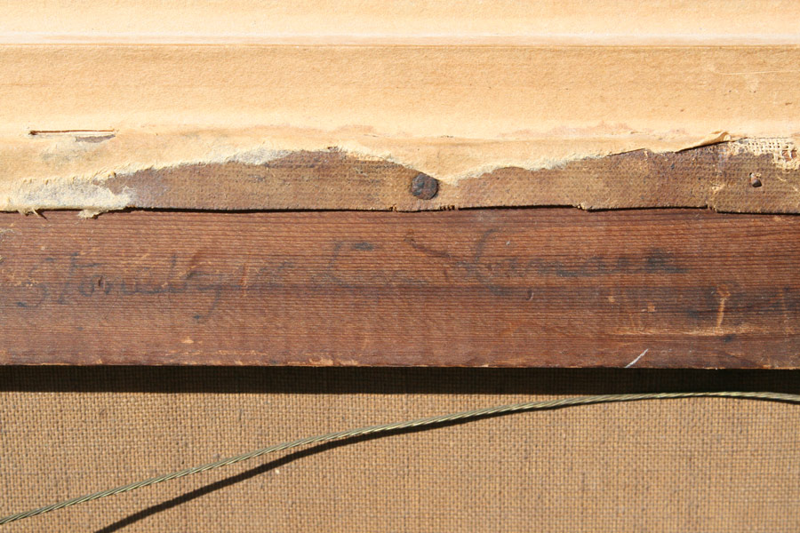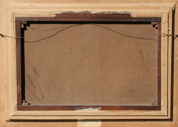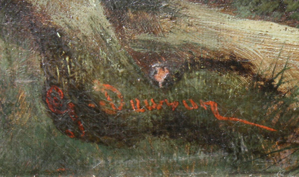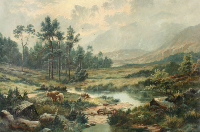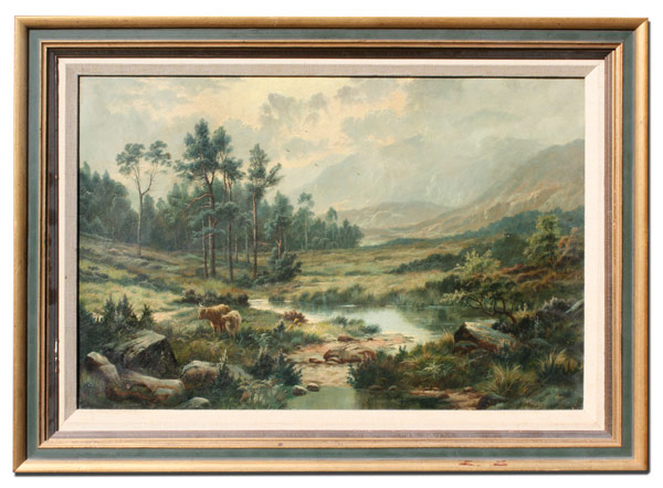 VERY GOOD HIGHLAND CATTLE PAINTING: OIL/Canvas, Depicts several cows in valley landscape, 16'' x 24'', signed G? Dawson?, framed 21'' x 28 1/2'', illegibly inscribed verso on the stretcher.