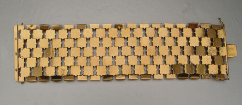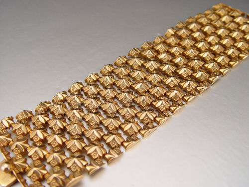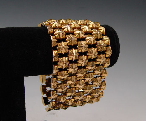 18K WIDE ROSETTE LINK BRACELET: 18K yellow gold bracelet of square rosette links. Stamped 750 and DL. 2'' wide, 7 3/4'' length. Weight: 98.5 grams.