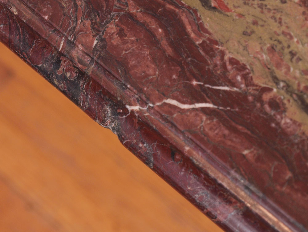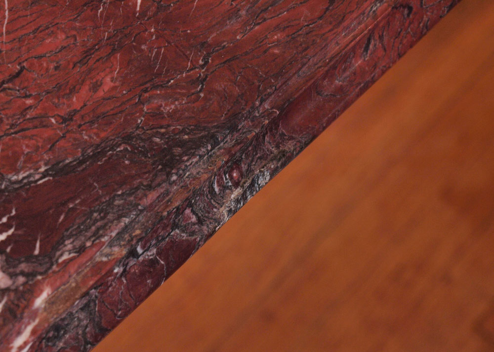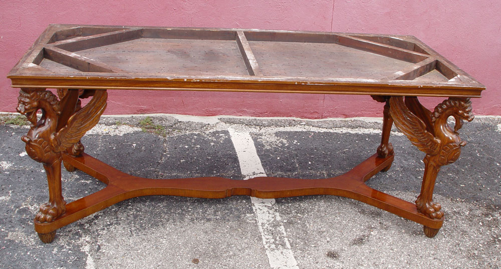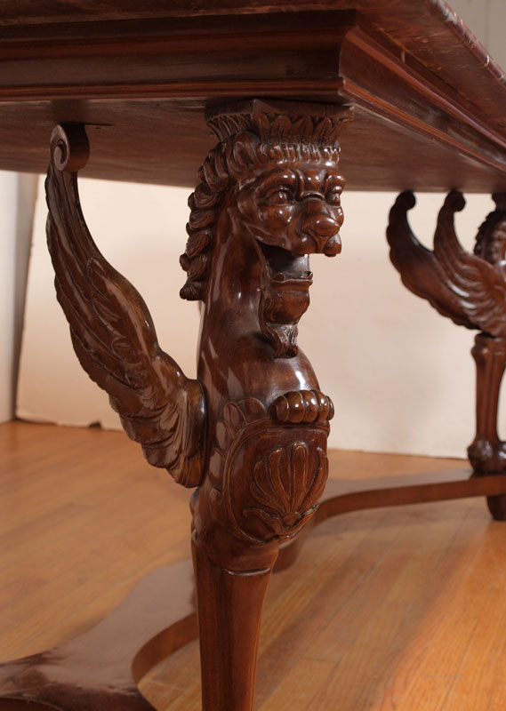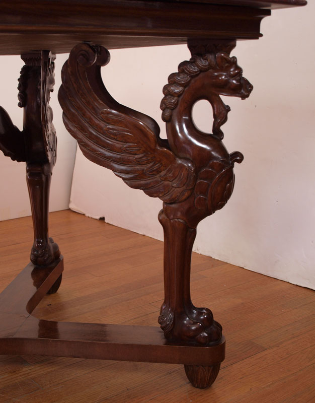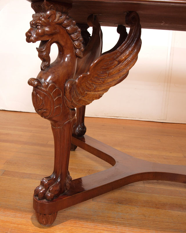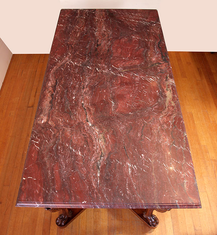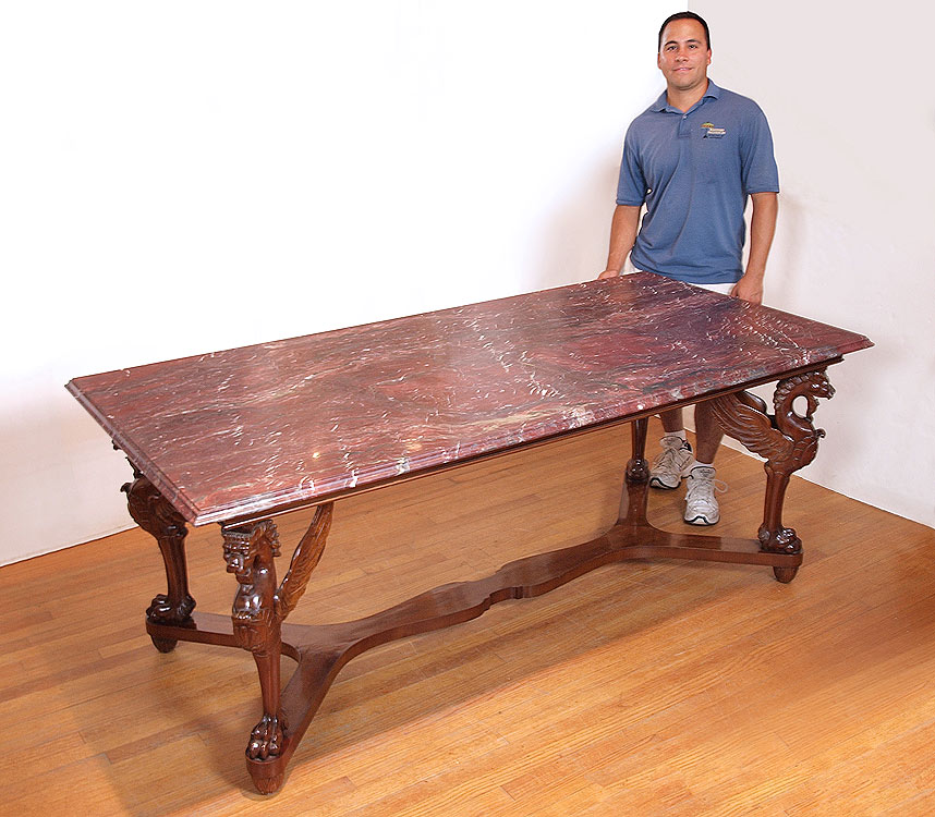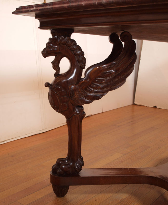 CARVED GRIFFIN MARBLE TOP DINING TABLE: Large heavy variegated maroon marble top on a four carved griffin leg support base. 32'' h. x 78 1/2'' x 37 1/2''