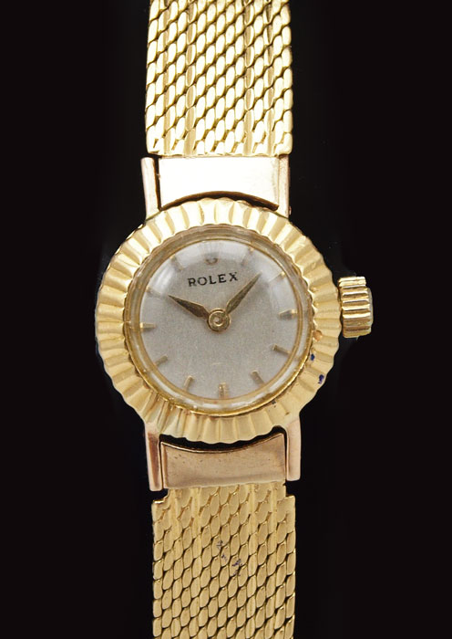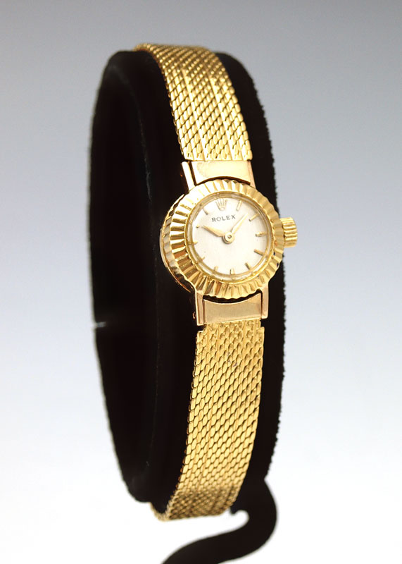 18K LADIES ROLEX DRESS WATCH: 18K yellow gold ladies Rolex, hallmarked on movement and case. Mechanical movement, caliber 1400, 17 jewels adjusted to 2 positions. In running order. Crown replaced with an Accutron. replaced crystal. The bracelet band is hinged at lugs to allow movement. Foldover clasp. 7''l. Weight 29 grams.