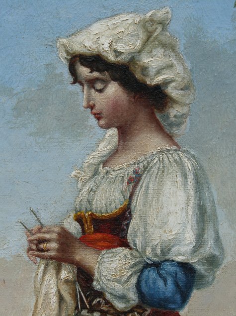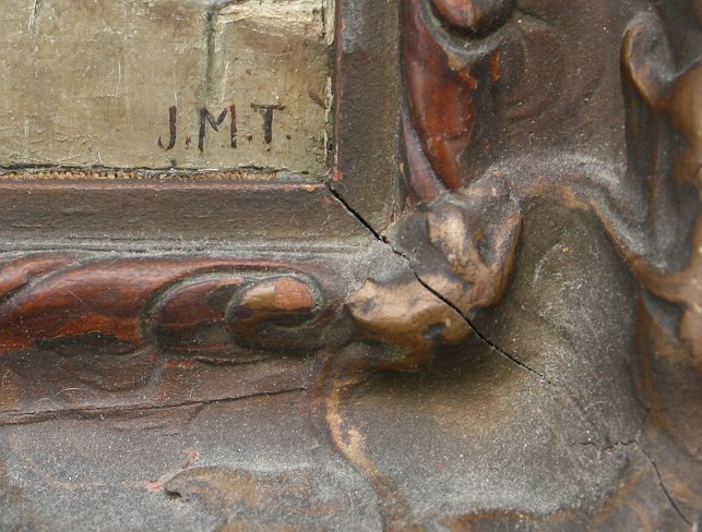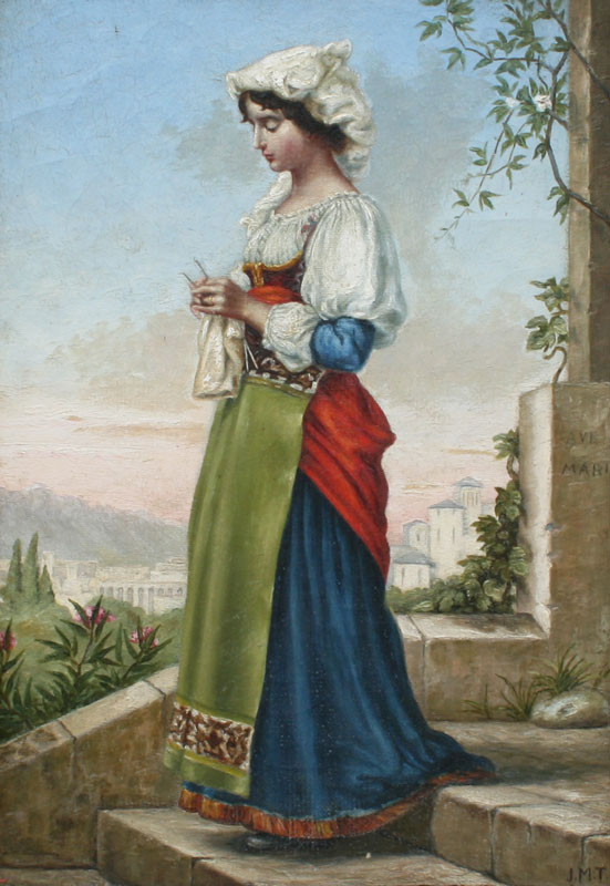 ITALIAN PAINTING OF AVE MARIA: OIL/Canvas, 11 1/2'' x 8'', monogrammed lower right JMT, period gilded gesso frame, 14'' x 10 1/2''.