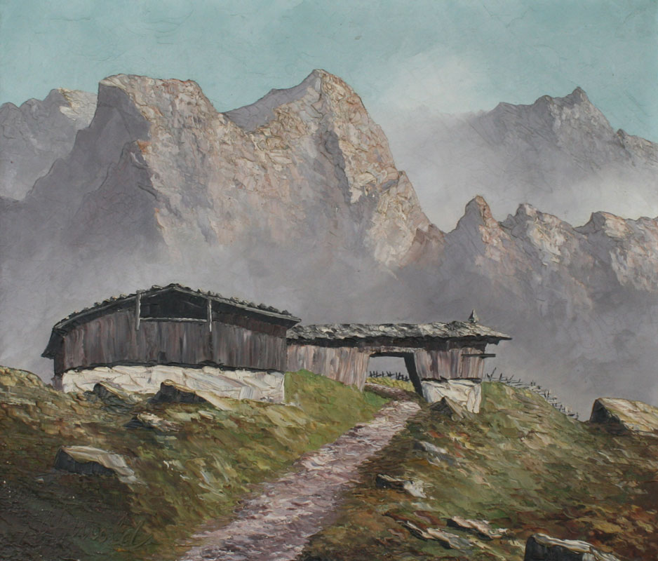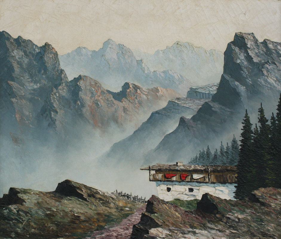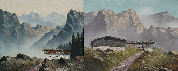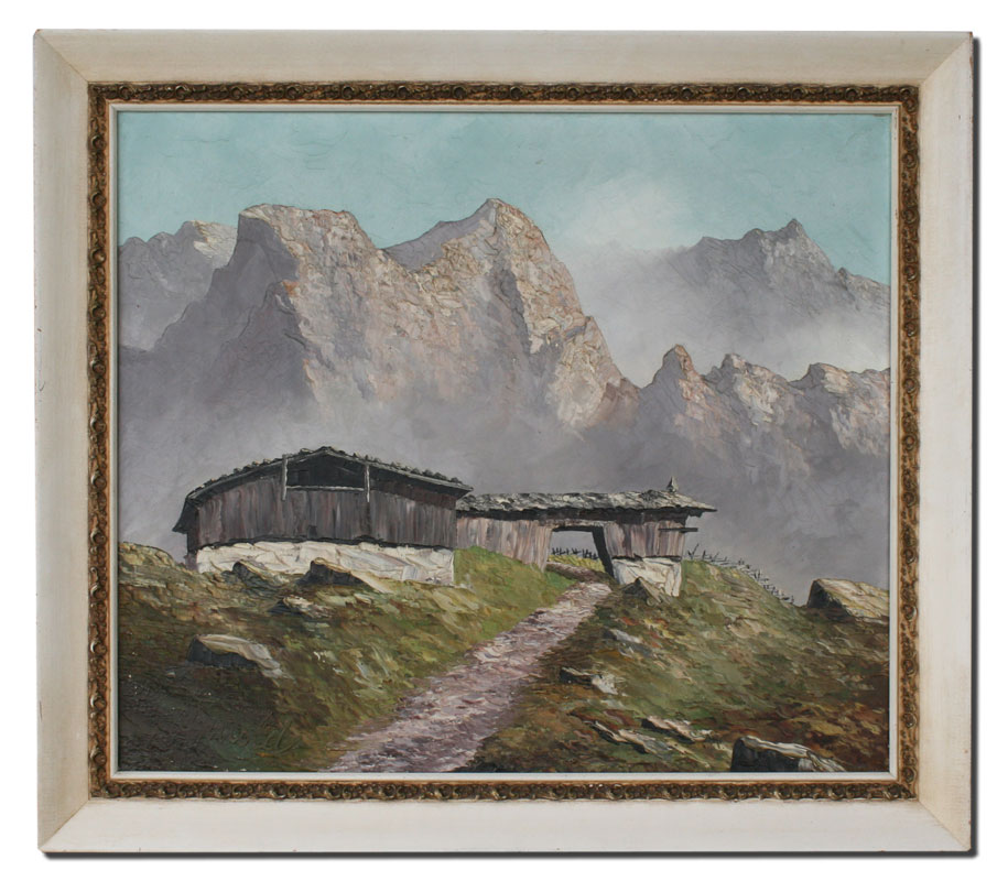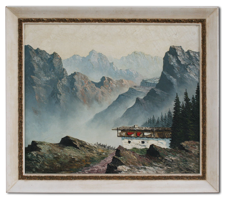 GRABONE, Arnold, (German, 1898-1981): Pair of European Landscapes with Alps and Chalets, 23 1/2'' x 27 3/4'', both are titled in German verso, painted white frames with wear, 30'' x 33''.