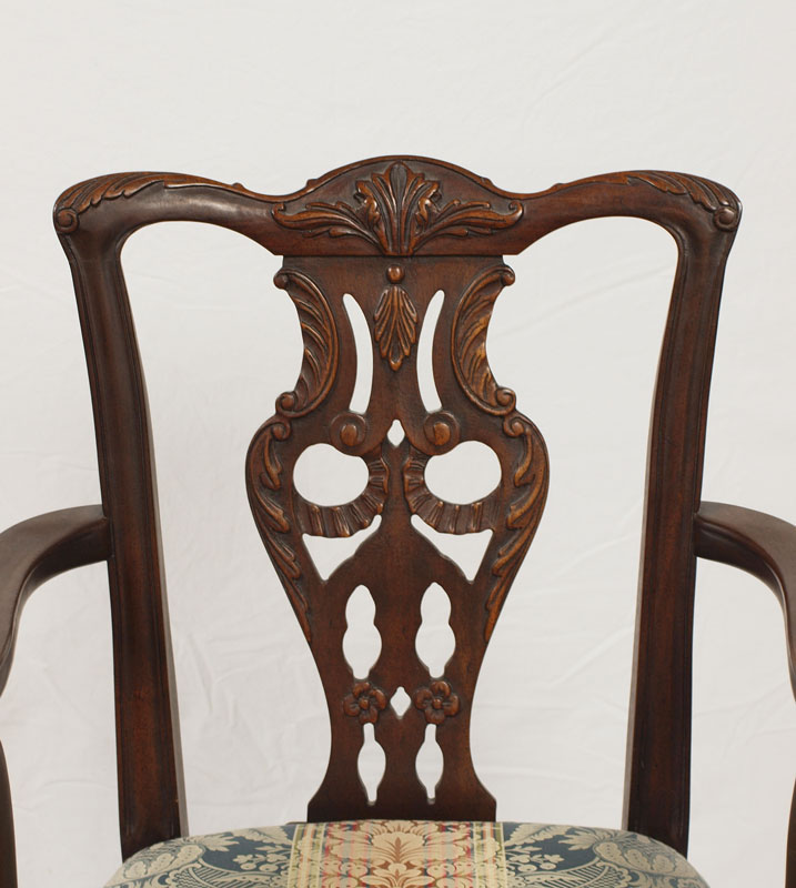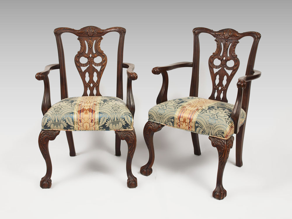 PAIR CHIPPENDALE STYLE ARMCHAIRS: Carved and shaped legs, back and hand rests. 36 7/8'' h. x 23 1/4'' x 21''.