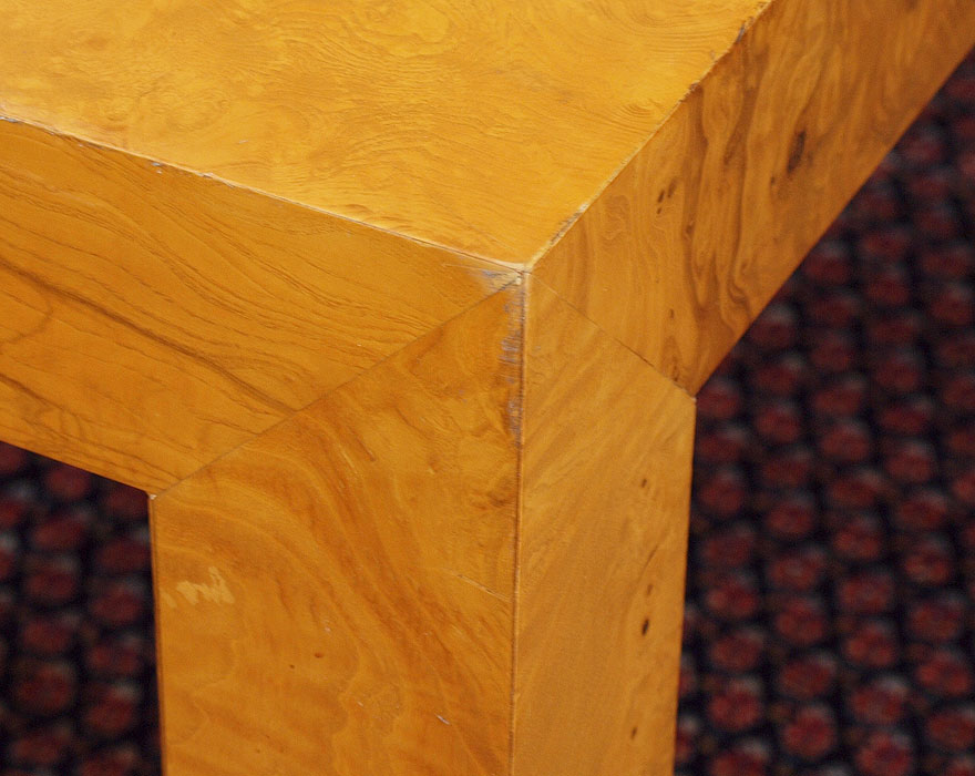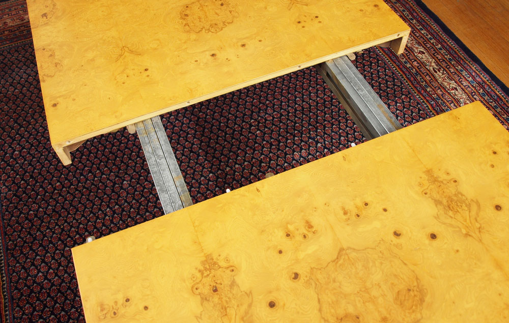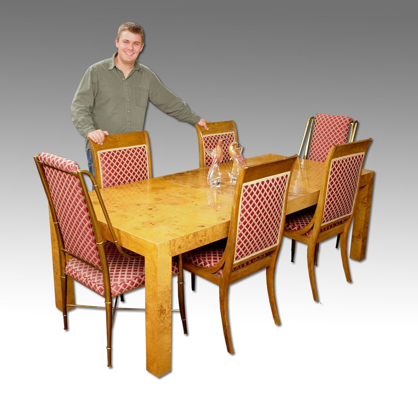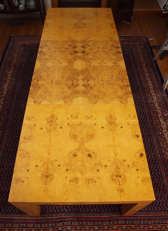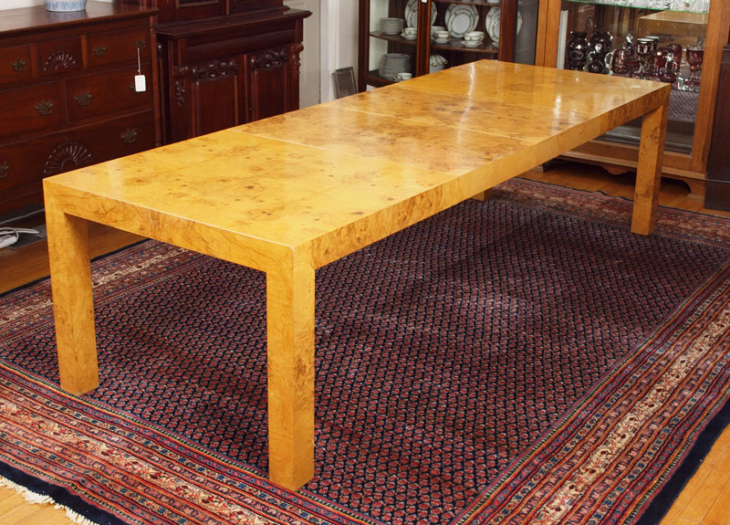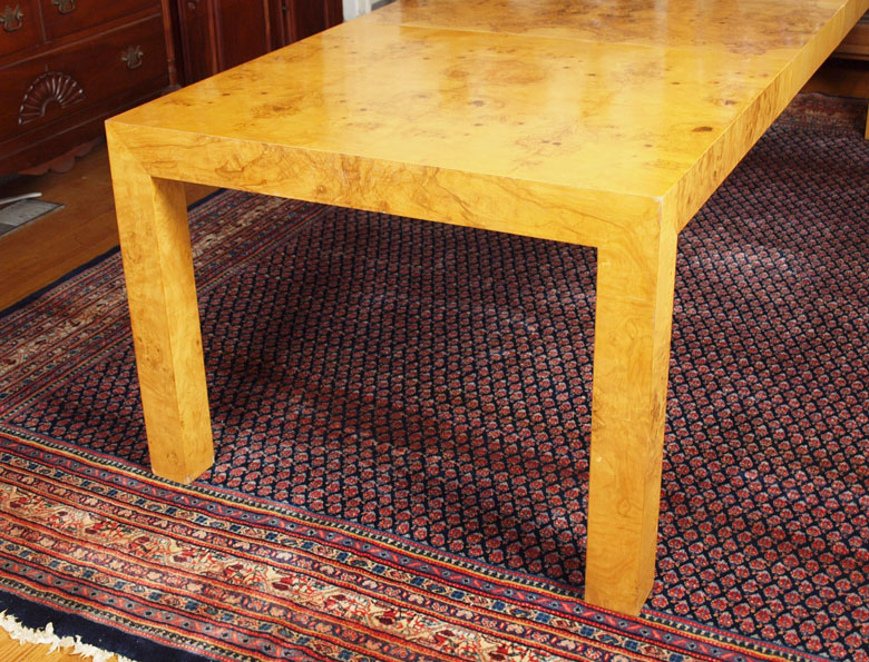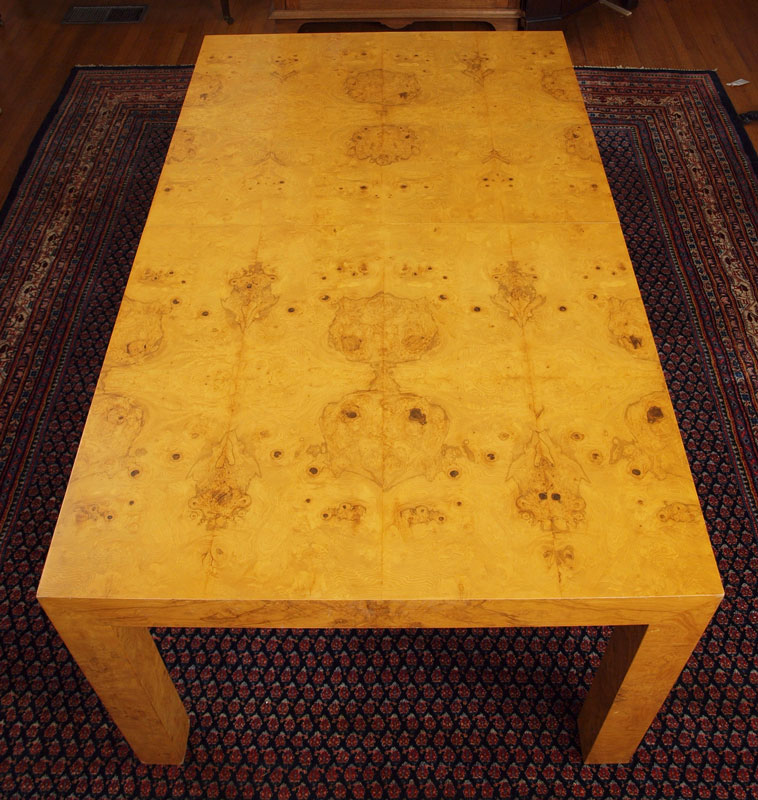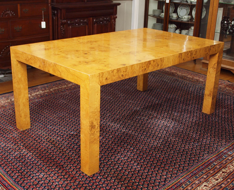 PARSONS TYPE BURLED WOOD VENEER DINING ROOM TABLE, LEAVES, AND 6 CHAIRS: TABLE, 28.5''h. x 38'' x 66'' length. With the pair of 22'' leaves the table extends to 110''. There are 4 burled veneer side chairs and 2 metal bamboo motif side chairs- all with matching fabric.