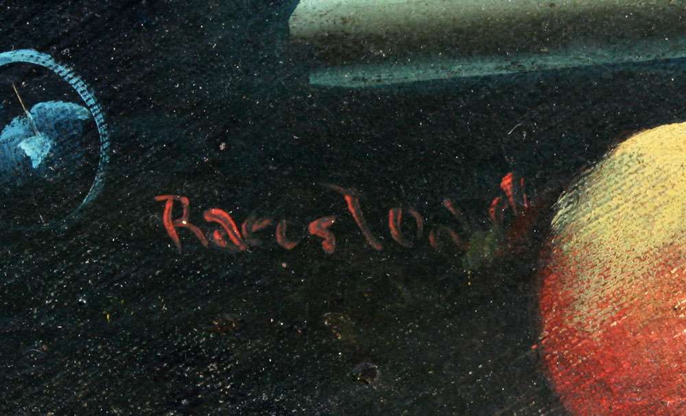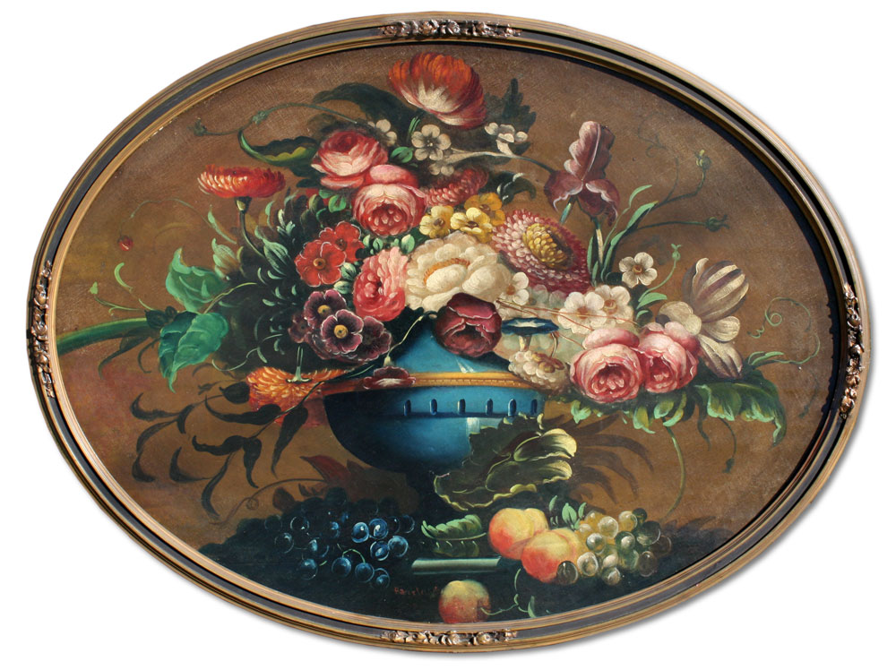 ILLEGIBLY SIGNED NEOCLASSICAL STYLE OIL/CANVASBOARD STILL LIFE: 30'' x 40'', gilded gesso frame with decorative paint showing some signs of wear, 33'' x 42'', oval shaped.
