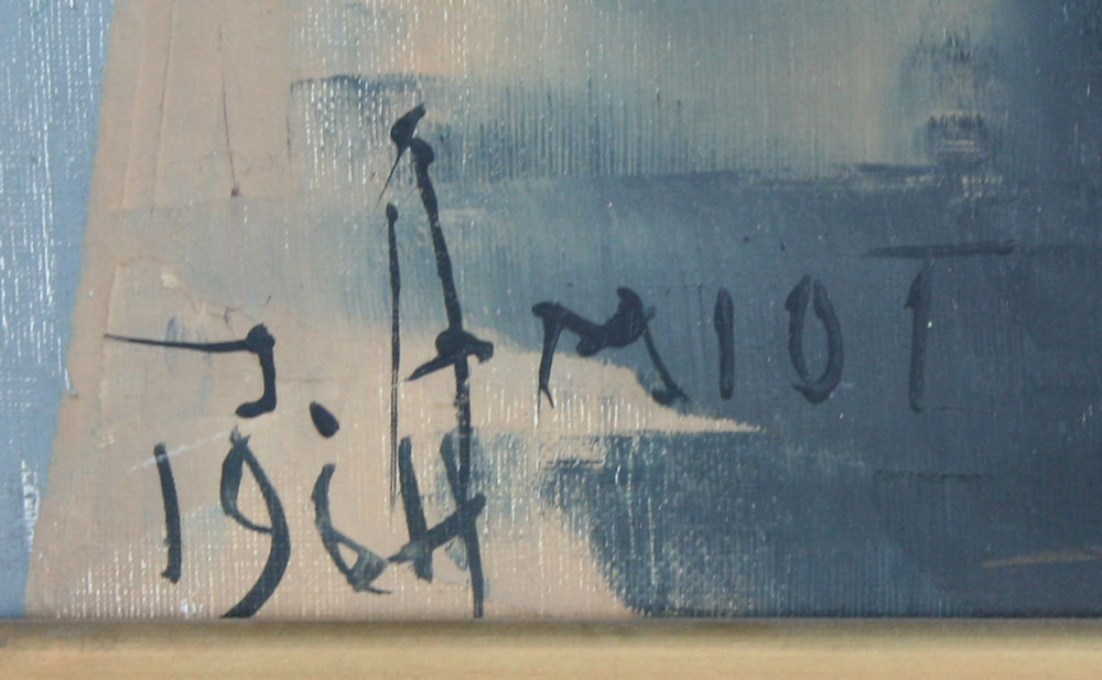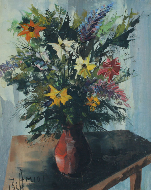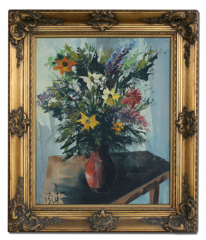 AMIOT, Jean, (French, 1920-): ''Fleurs'', Still Life with Flowers in a Vase, OIL/Canvas, 21 1/2'' x 18'', signed and dated 1964, signed titled and dated verso, gilded gesso frame, 28'' x 24''.