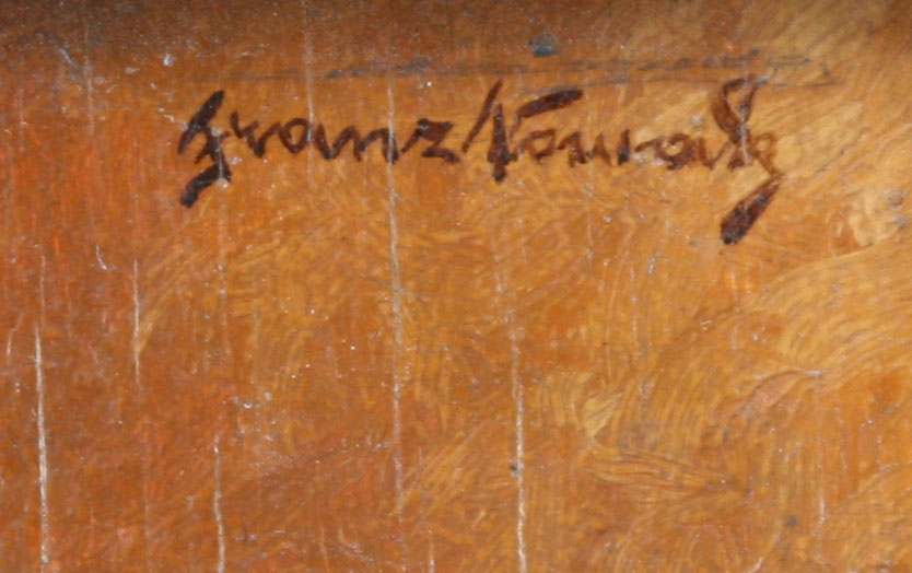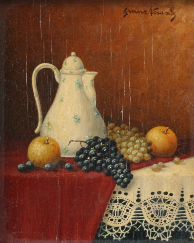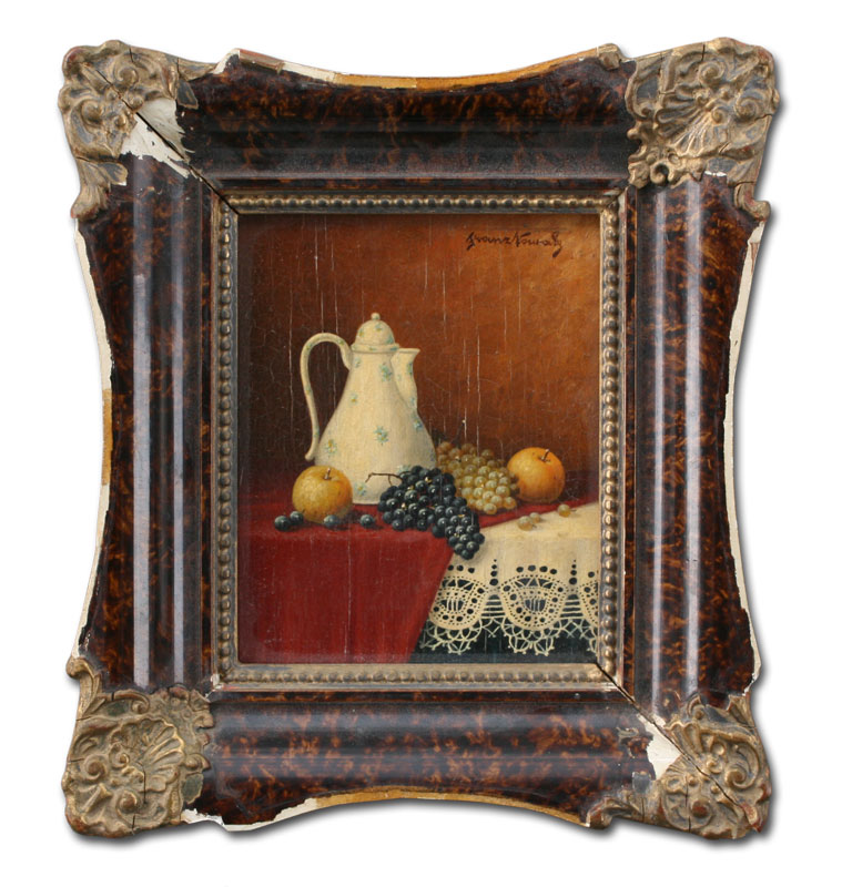 MINIATURE STILL LIFE WITH FRUIT AND TEAPOT: Illegibly signed, 4'' x 3 1/4'', cased in faux tortoise shell and gilded gesso frame with wear, 6 1/2'' x 5 1/2''.