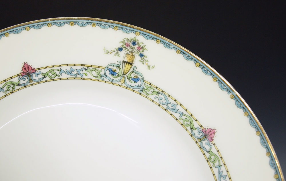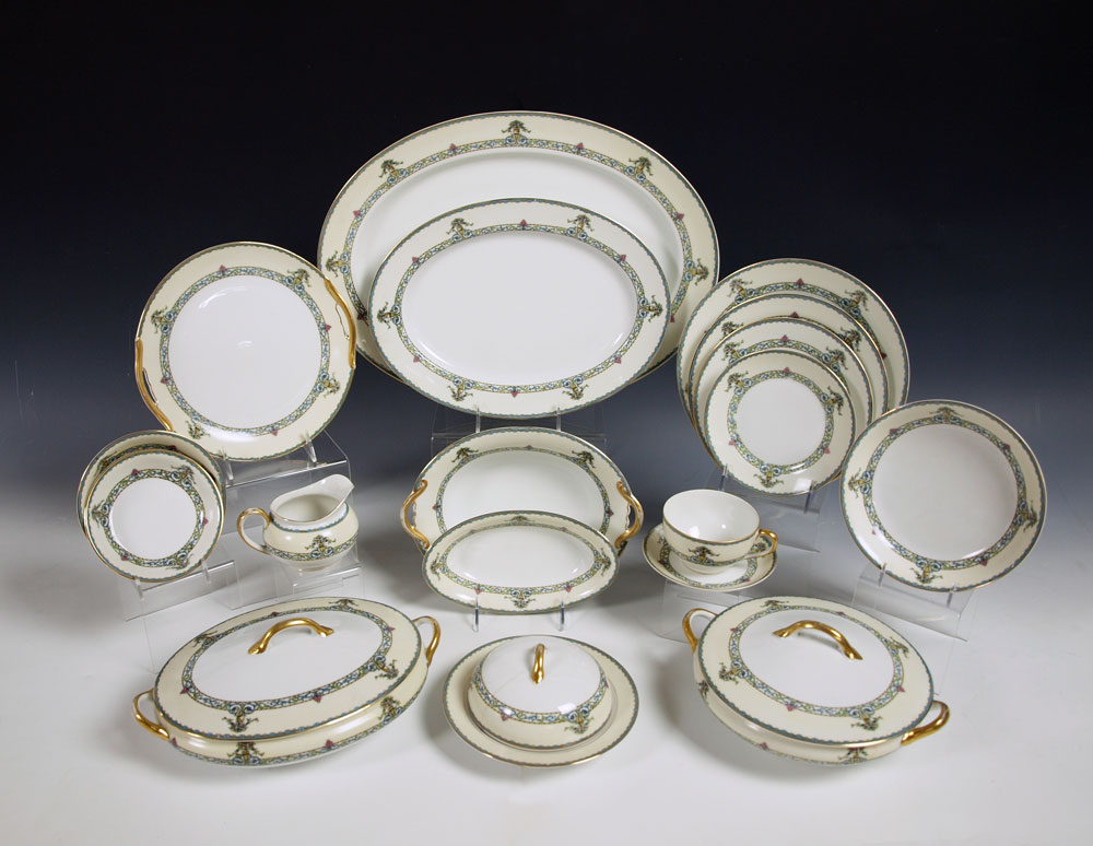 NORITAKE FINE CHINA IN THE DARBY PATTERN: Approx, 119 pieces to include 12 dinner plates, 9 luncheon plates, 11 salad plates, 12 bread plates. 12 soup bowls, 6 cereal bowls, 15 dessert bowls, 6 coffee cups, 13 tea cups, 16 saucers, a pierce handle cake plate, relish dish, open vegetable, 2 covered vegetable, and 2 platters, 13.5 and 17.5''.