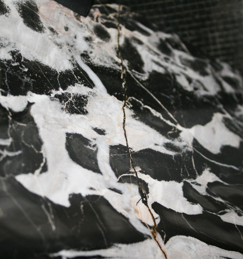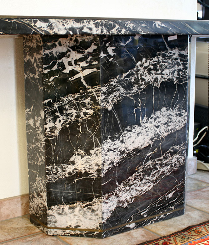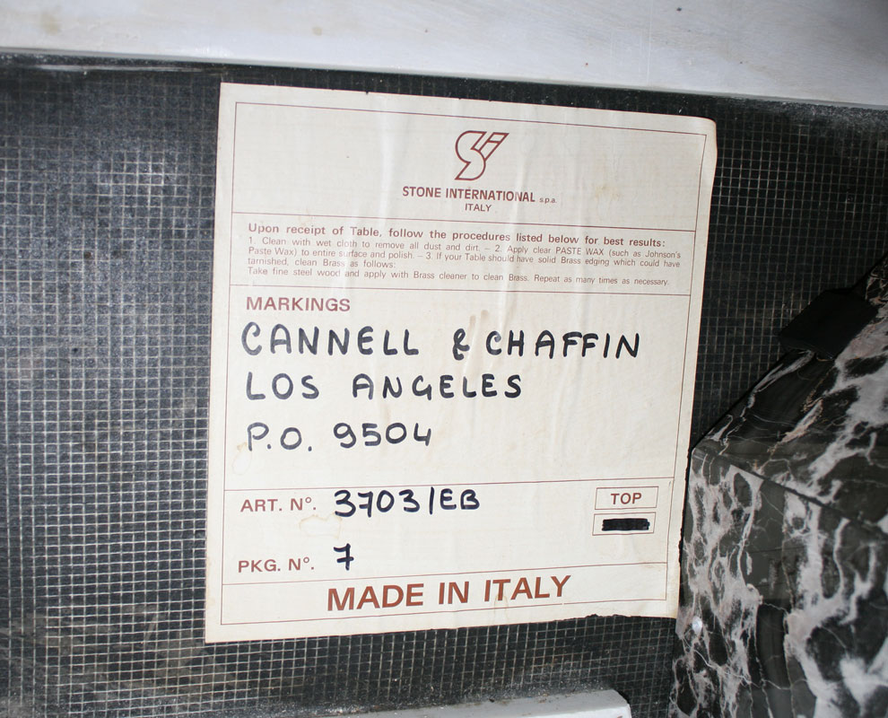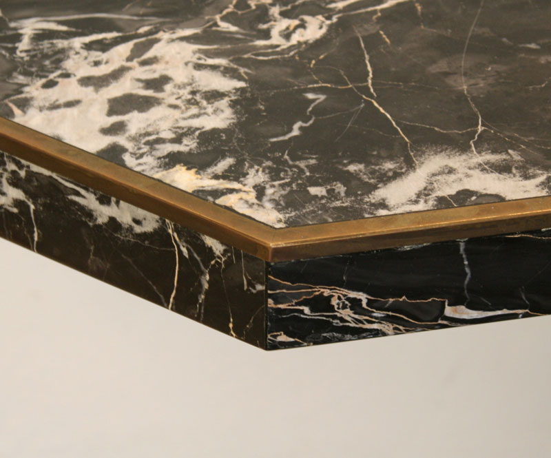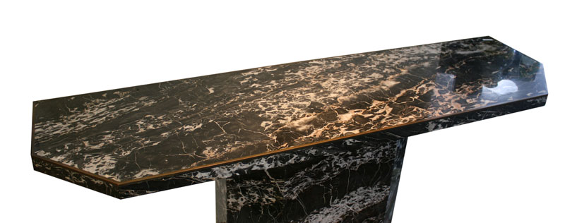 ITALIAN MARBLE CONSOLE TABLE: With bronze edging. Hollow base supports the elongated top. Stone International, Made in Italy. Very slightly visible restoration on the base. 30'' x 71'' length x 20'' deep.