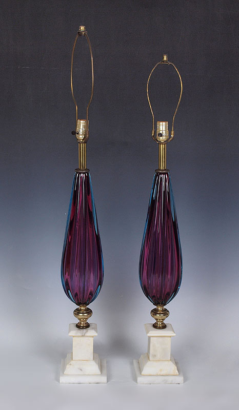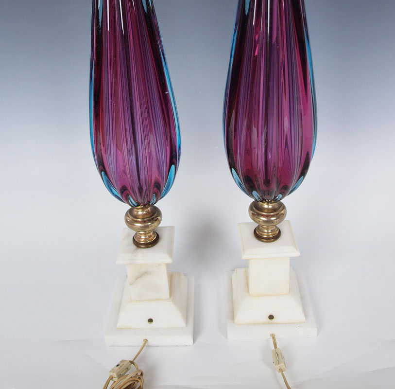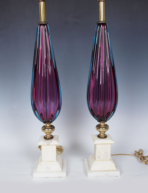 PAIR MURANO GLASS LAMPS WITH MARBLE BASES: Purple Murano glass middle with marble pedestals. No shades. Base 25'' h. x 5 1/2'', overall 30 1/2'' to socket.