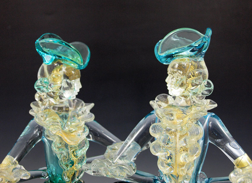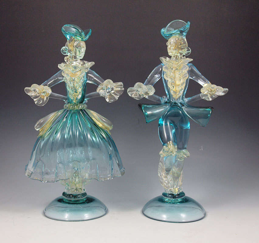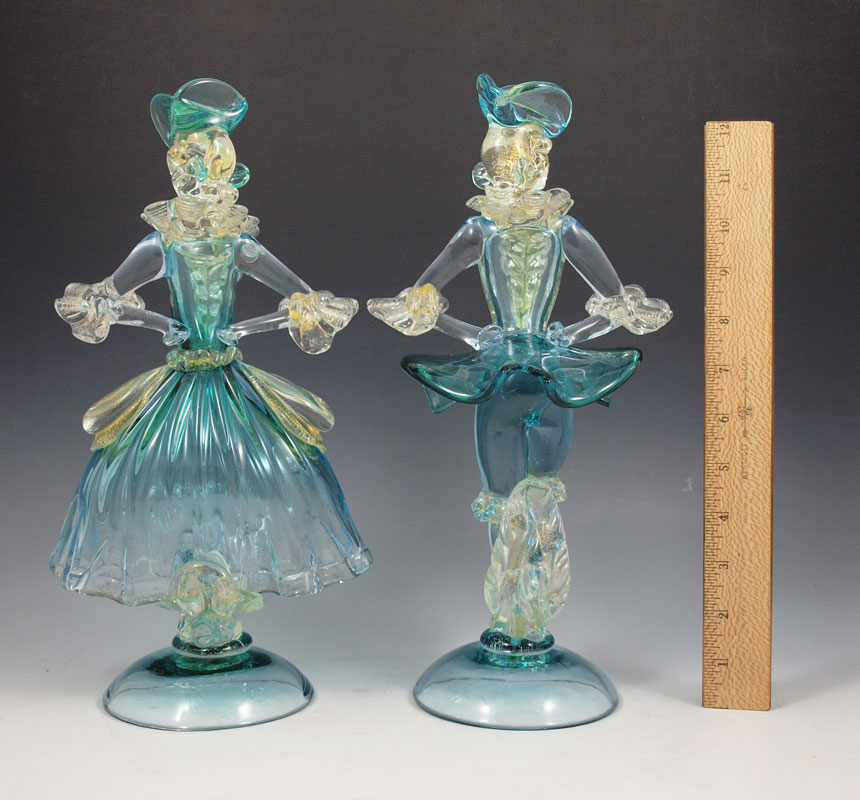 PAIR AVENTURINE MURANO GLASS FIGURES: Figure of man and woman, on circular bases, probably by Barovier & Toso. 13'' h.