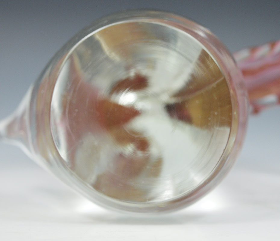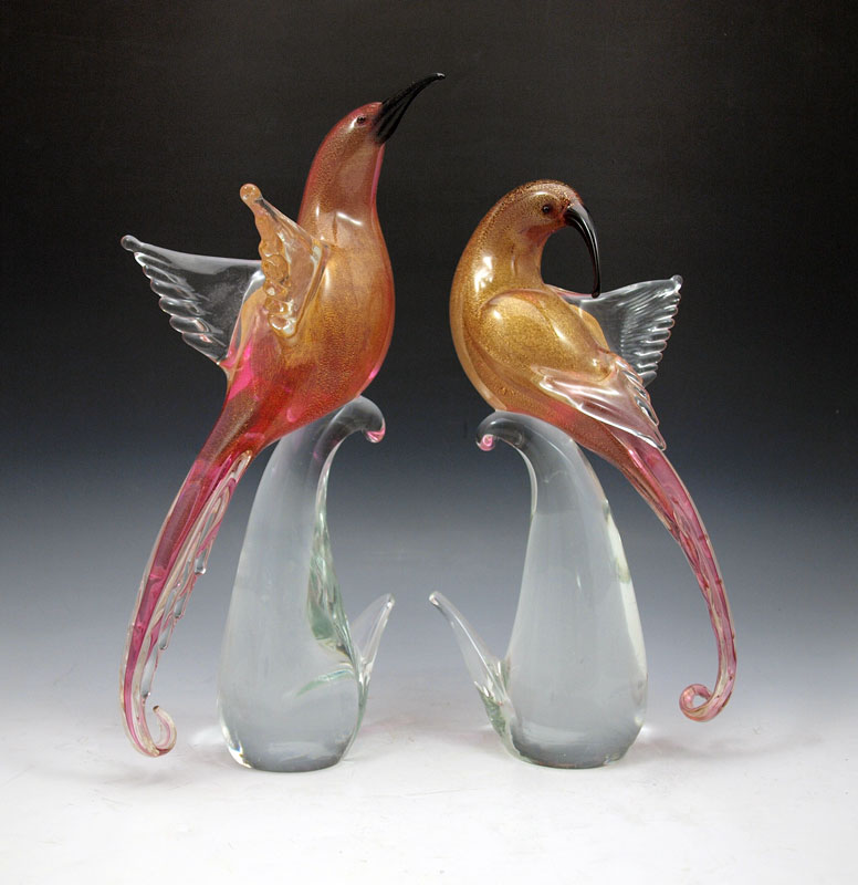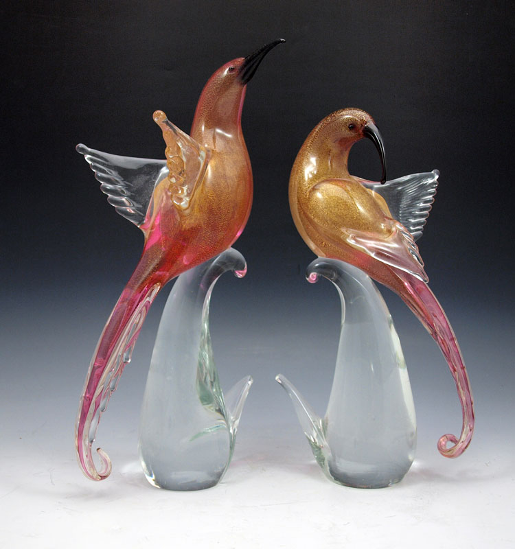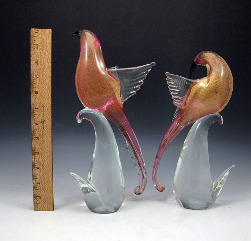 PAIR MURANO AVENTURINE GLASS BIRDS: Pinks with gold aventurine flake bodies, clear glass wings & pedestals. Larger of 2 measures 12 3/8'' x 6 1/4'' x 5 1/4''.