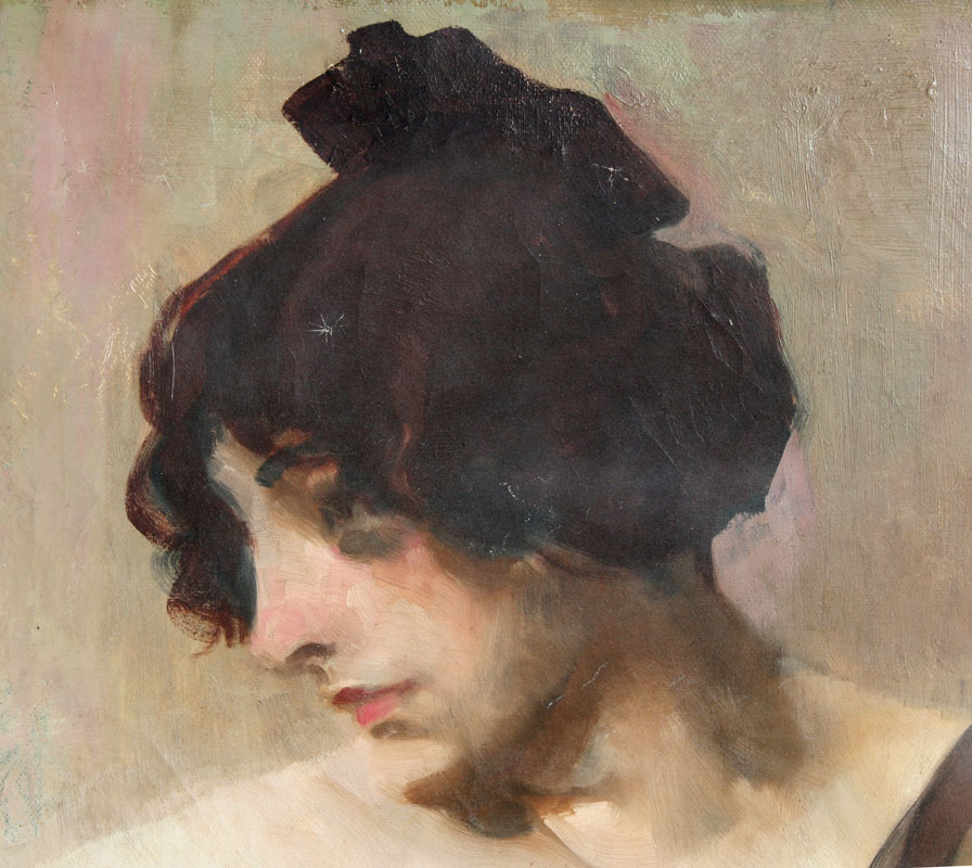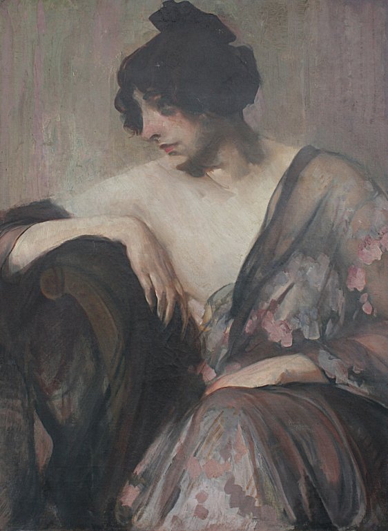 EXCEPTIONAL OIL/CANVAS PORTRAIT OF A SEATED FIGURE IN A ROBE: No visible signature, 39'' x 29 1/2'', style is reminiscent of some of the finest painters of the early 20th century.