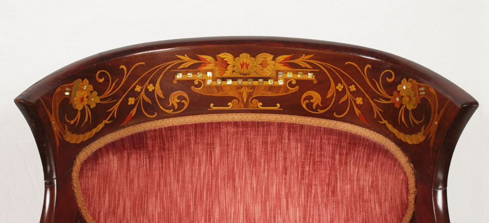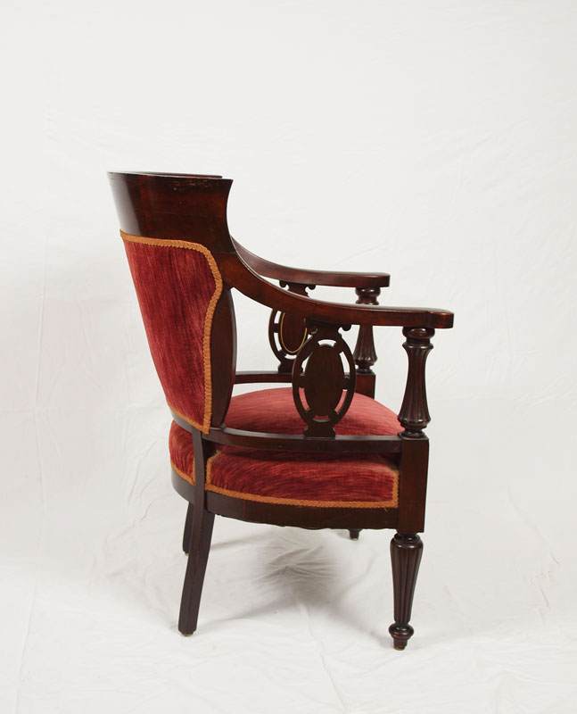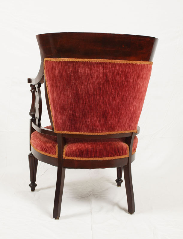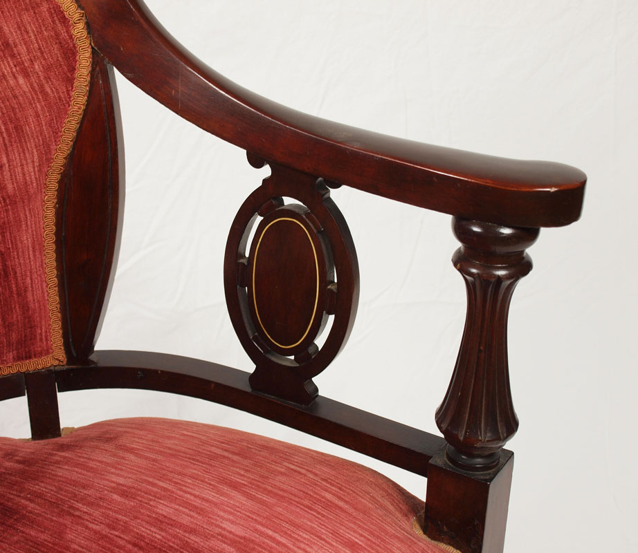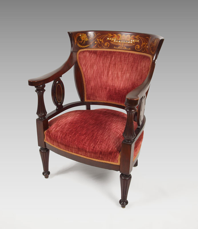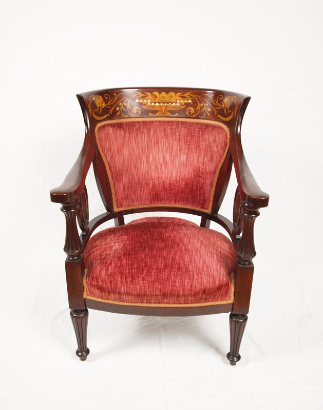 EDWARDIAN MOTHER OF PEARL AND MARQUETRY INLAY ARM CHAIR: Large frame balloon back with wood frame. Upholstered seat and back in two tone shades of cranberry. Turned and ribbed column front and legs. 37 1/2'' x 25 1/2'' x 26''.