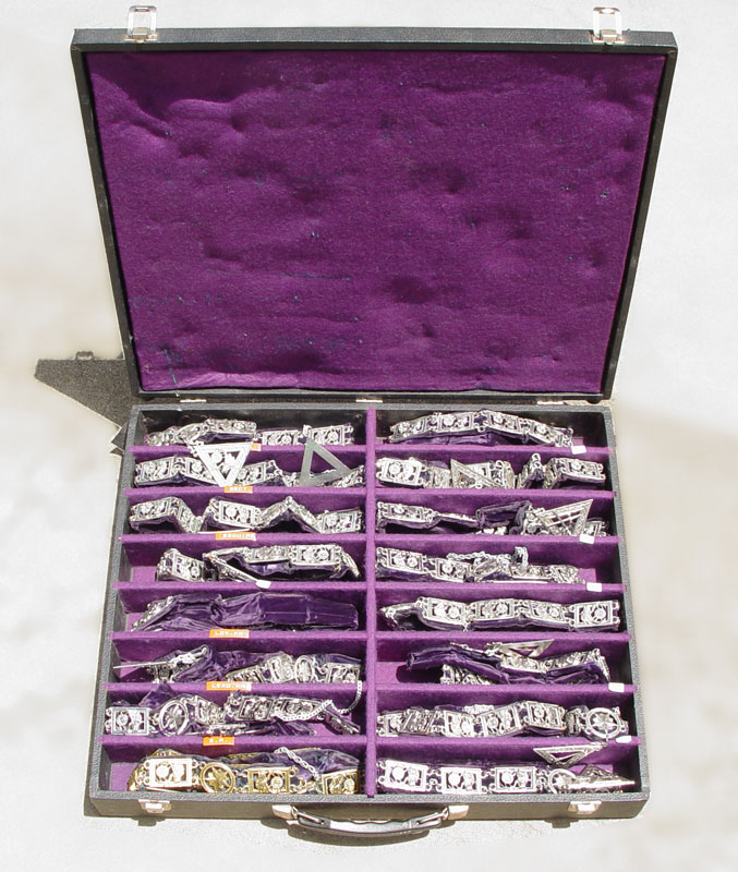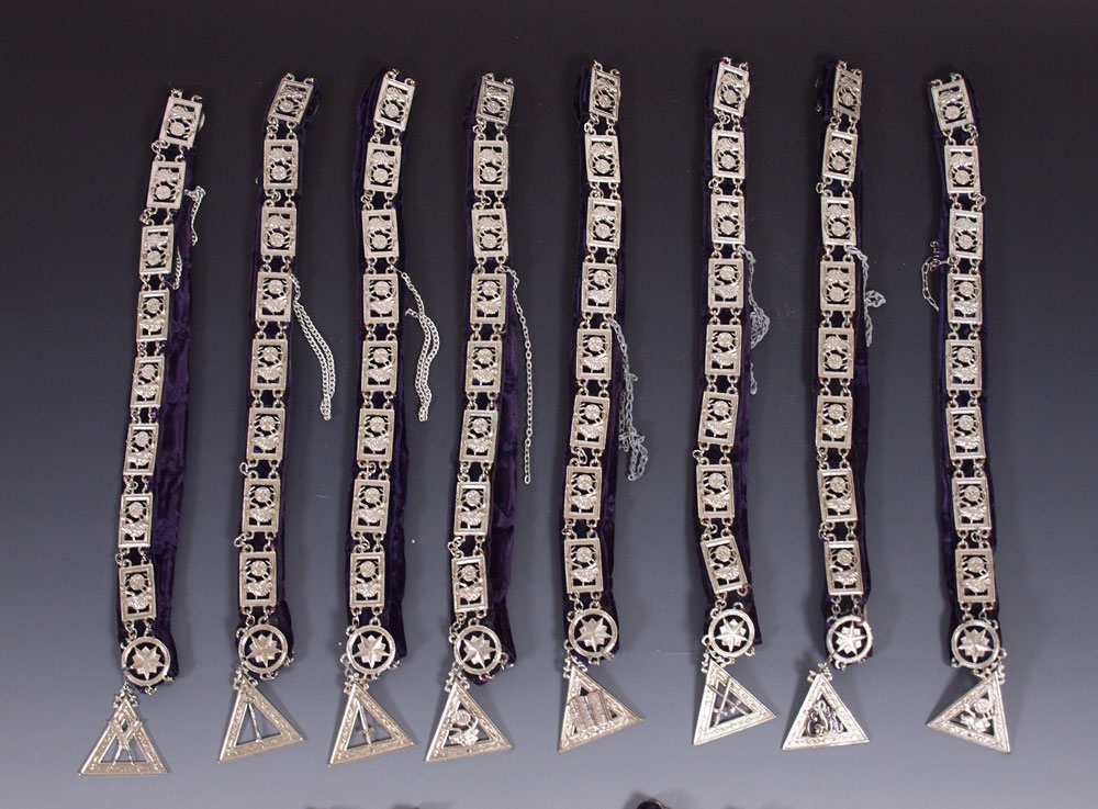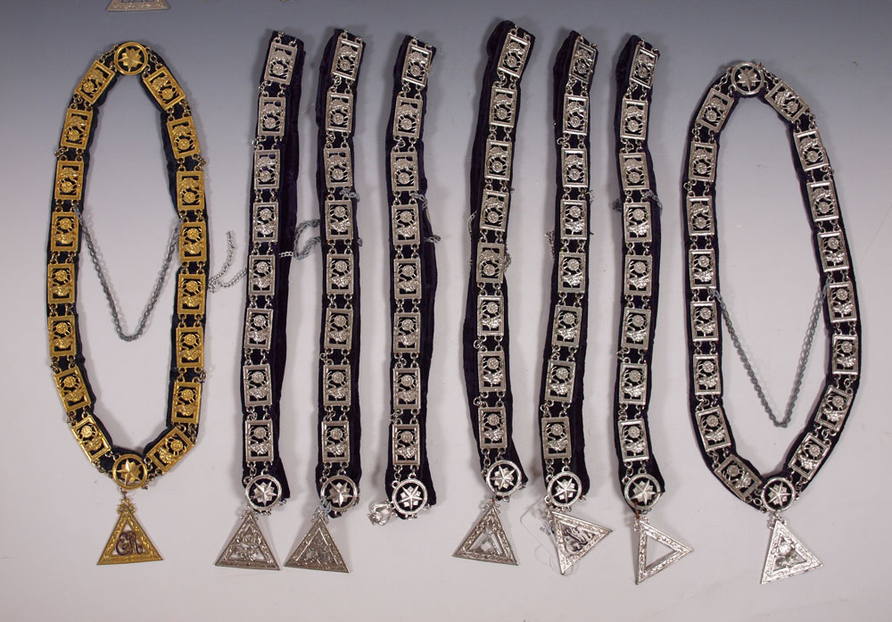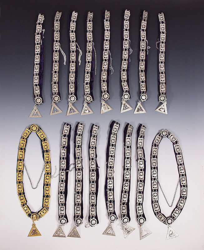 CASED ELKS LODGE COMPLETE SET CHAINS OF OFFICE: Include 16 office chains, gold toned Exhalted Ruler, balance are silver toned. Unique collection of the office chains all together. Case measures 3 3/4'' x 23'' x 21''.