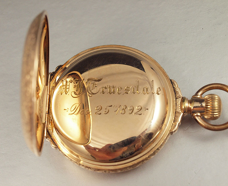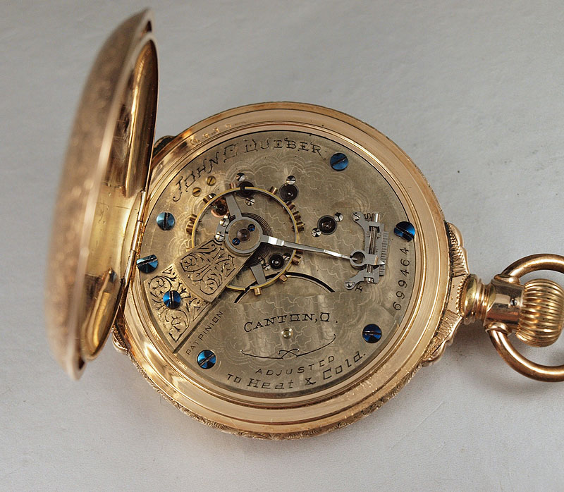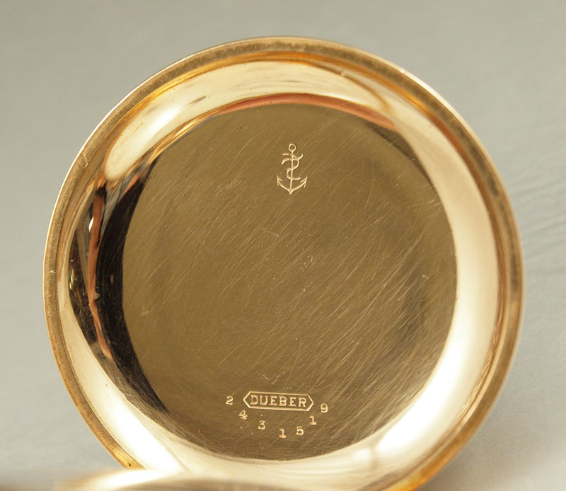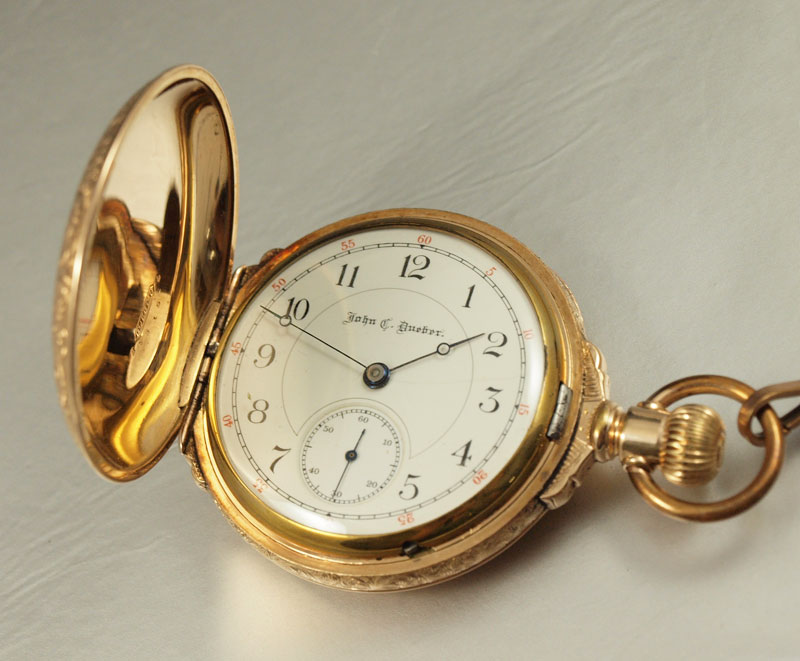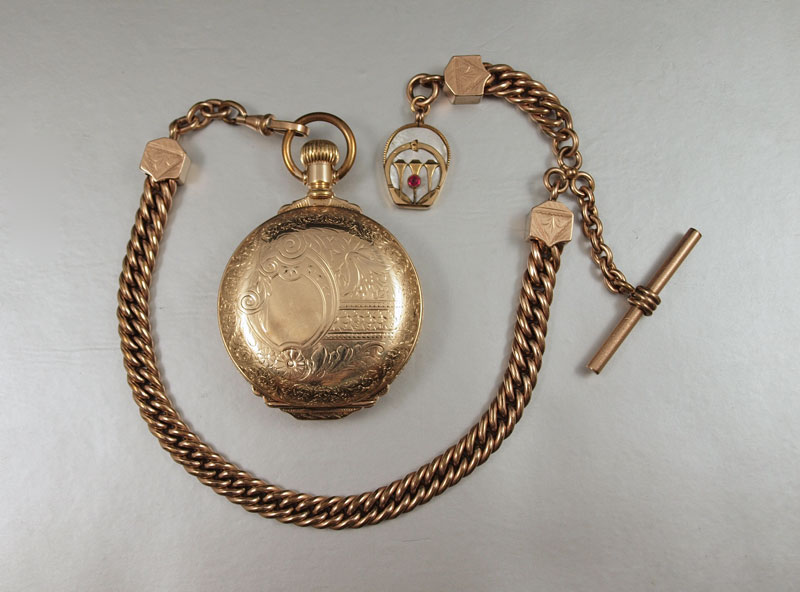 JOHN DUEBER GOLD FILLED BOX CASE POCKETWATCH WITH CHAIN & FOB: Ca. 1894. Box case is proper and original to movement, as is bow and crown. Dueber size 18 with 17 jewel movement in running condition. Standard length chain with unusual mother of pearl and ruby ornamentation.