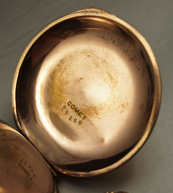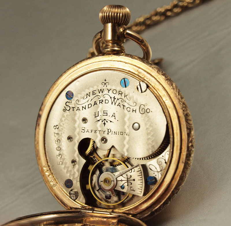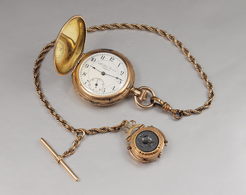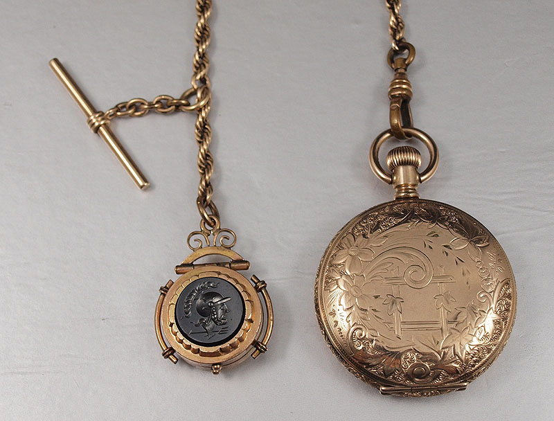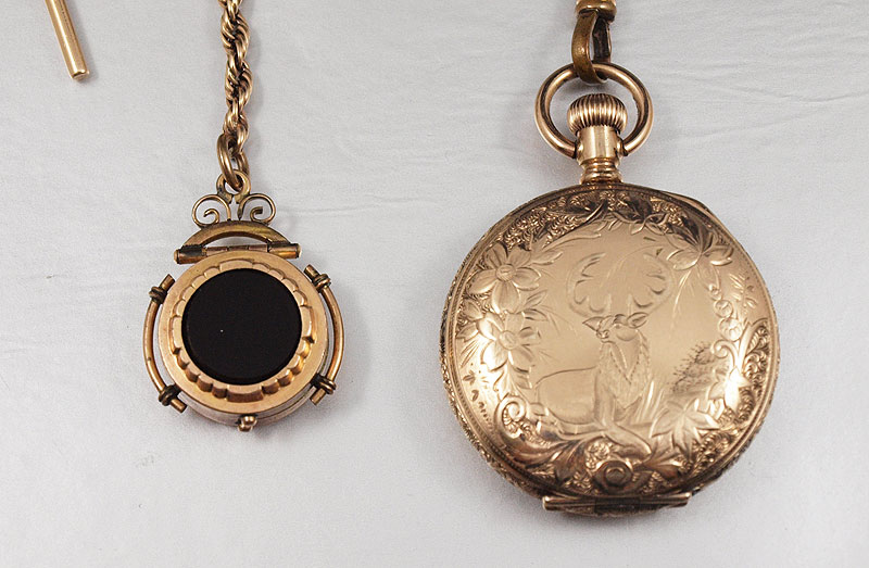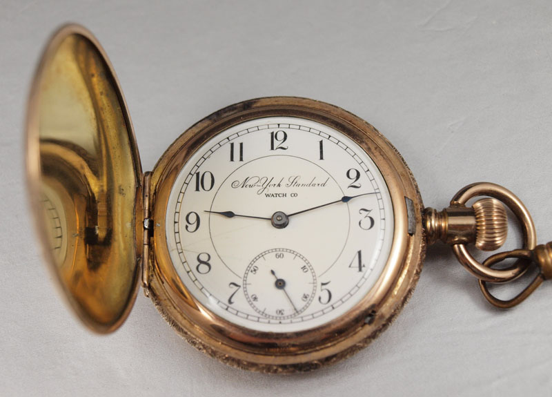 N.Y. STANDARD POCKET WATCH WITH CHAIN AND FOB: Size 6 gold filled pocket watch in hunter case. 7 jewel movement in running order. Bow and crown original to watch. Chain and picture holder fob.