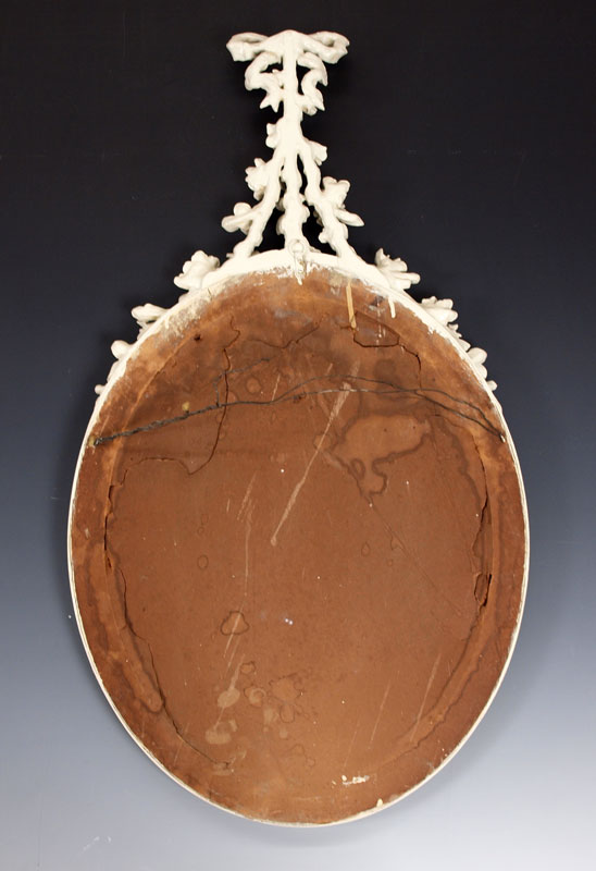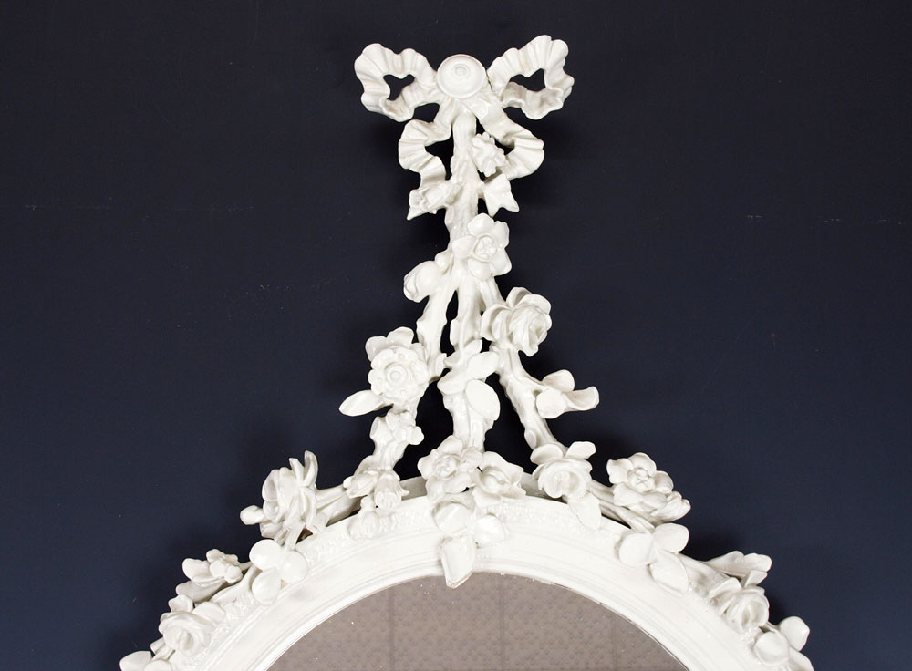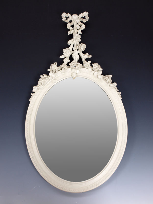 WHITE PAINTED FLORAL SWAG FRAMED MIRROR: 32 3/4'' h X 18''.