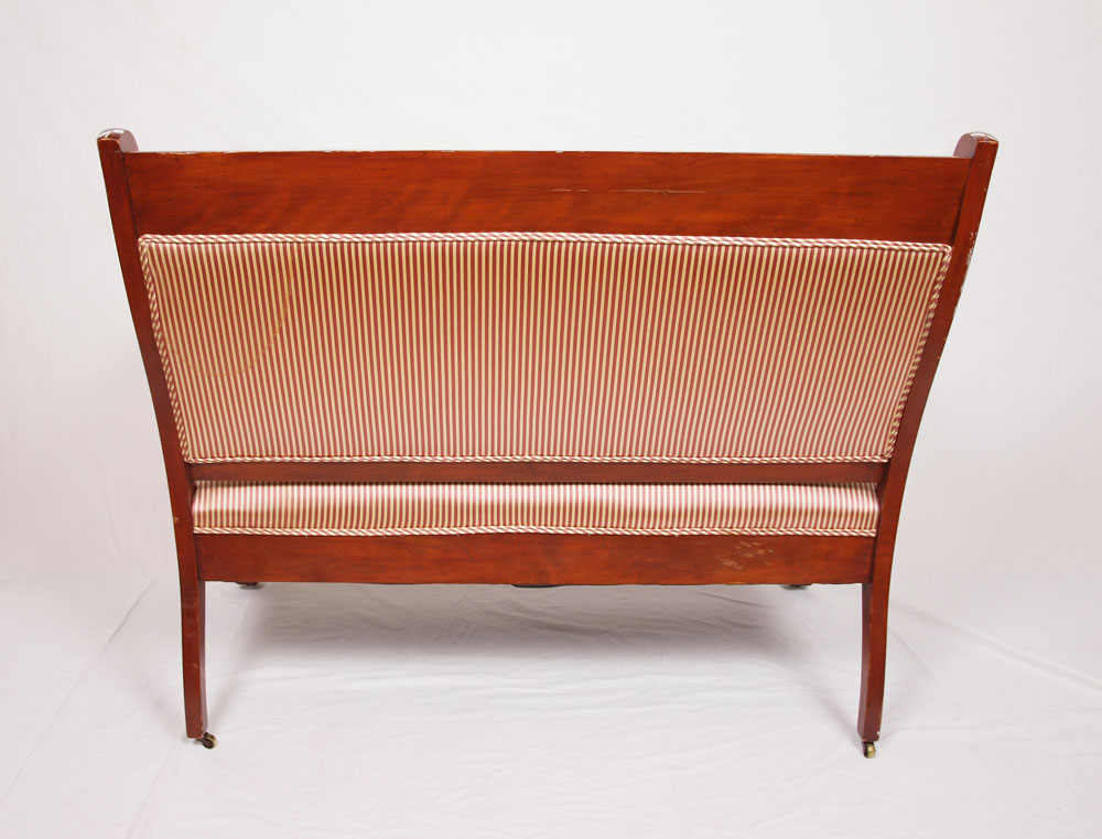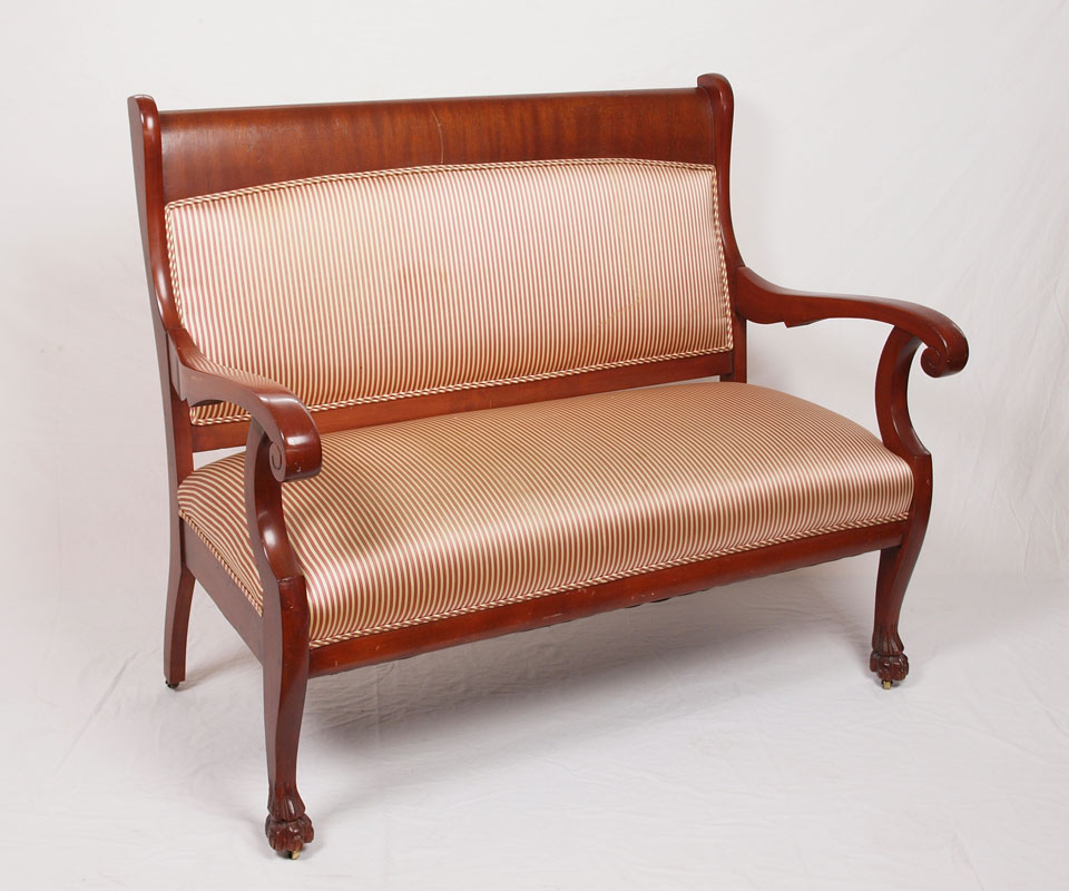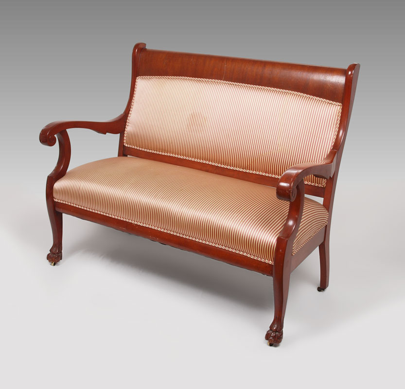 VICTORIAN MAHOGANY UPHOLSTERED HIGH BACK BENCH SEAT: Mahogany frame with rolled arms, carved paw feet and castors. Striped upholstered seat and back of rose and cream colored silk. 42 1/2'' h. x 50 3/4'' x 28 1/2''.
