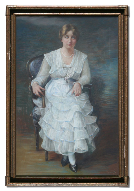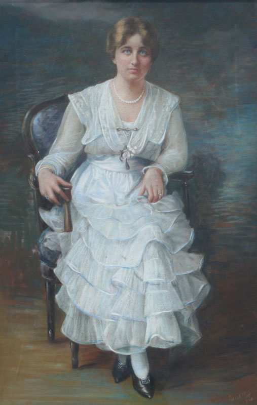 EARLY 20TH CENTURY PORTRAIT OF A YOUNG WOMAN SEATED IN A CHAIR: Pastel/Paper laid down on canvas, signed lower right Phillips and dated 1920, sight size 39'' x 25'', gilded frame with minor wear, 44'' x 33''.
