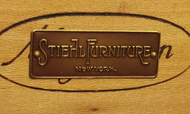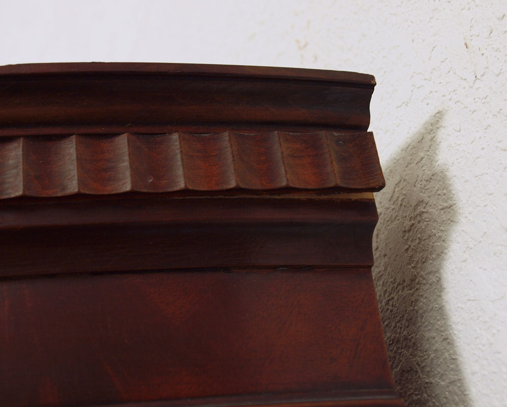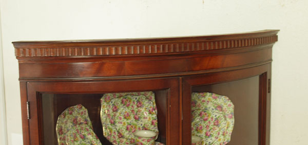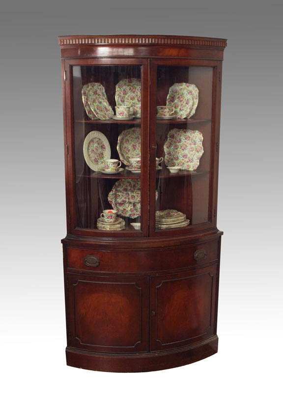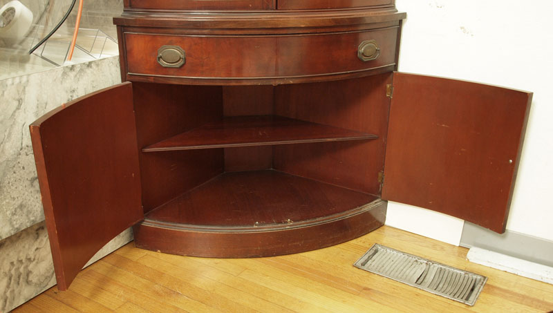 MAHOGANY CURVED FRONT CORNER CABINET: 2 glass door top over one drawer and 2 door base. 72'' h. x 37'' x 19''. Retailed by Stiehl Furniture, New York.