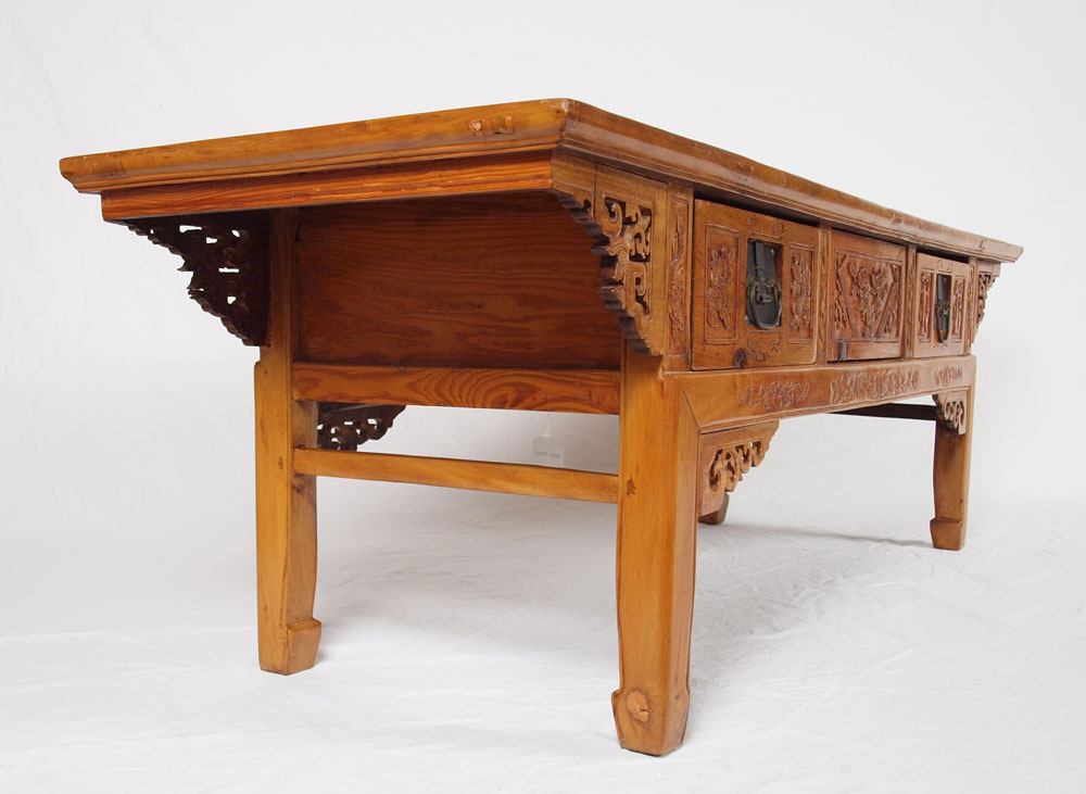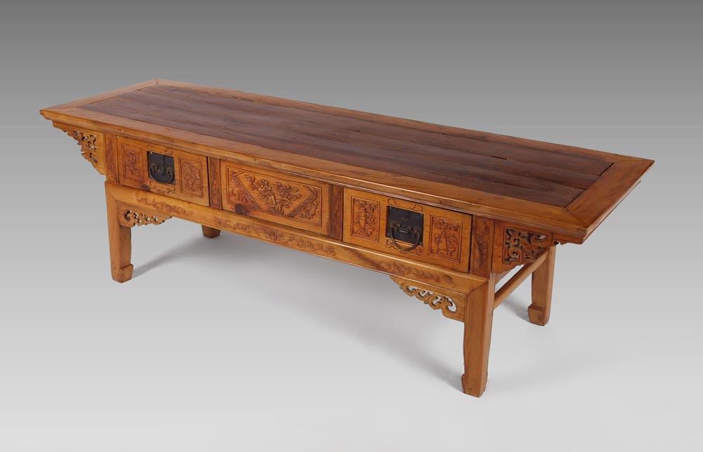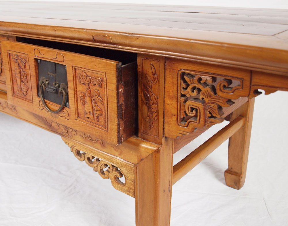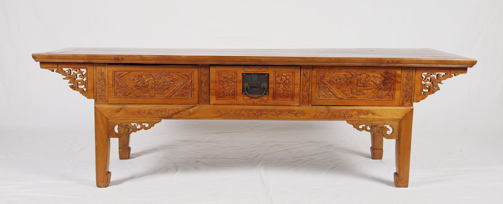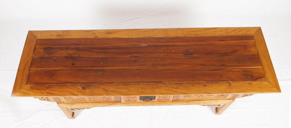 CHINESE LOW TABLE: 2 drawers with carvings. 19 3/4'' h. x 64 1/2'' x 19 1/2''.