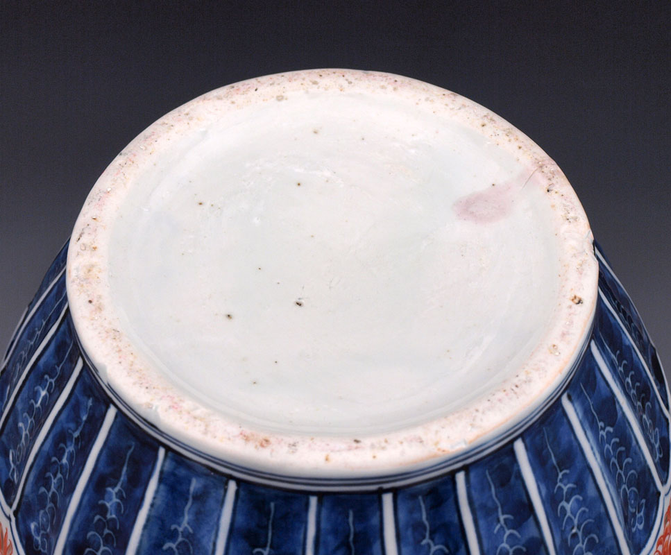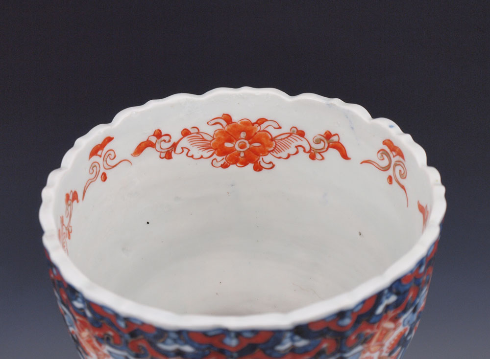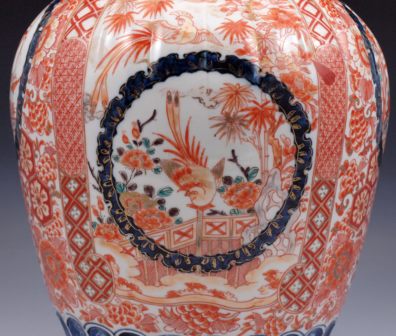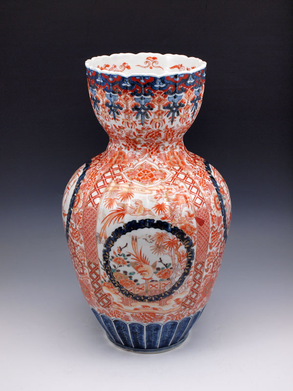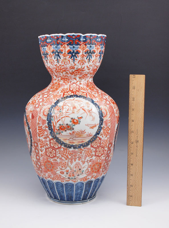 IMARI PORCELAIN CRIMPED NECK VASE: 16'' tall, in the red and blue Imari colors.