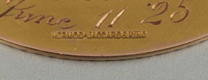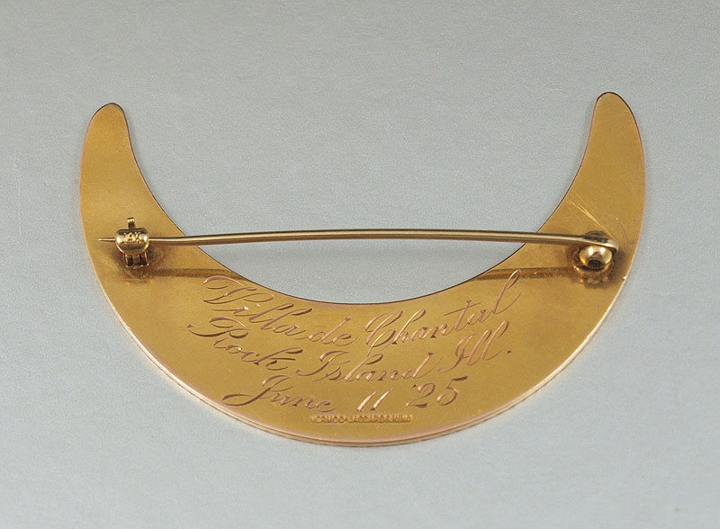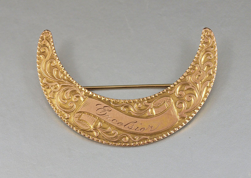 14K ANTIQUE CRESCENT MOON BROOCH: The front is engraved with a scroll and floral design with script ''Excelsior'' The reverse is engraved with script ''Villa de Chantal, Rock Island, Ill, June 11, '25 Signed: Mermod, Jaccard & King. Weight: 11.7 grams.