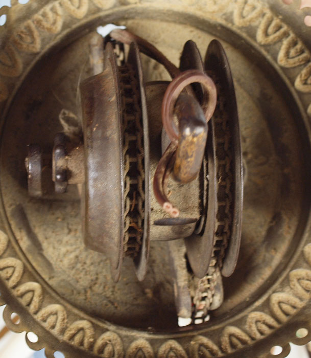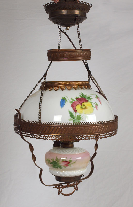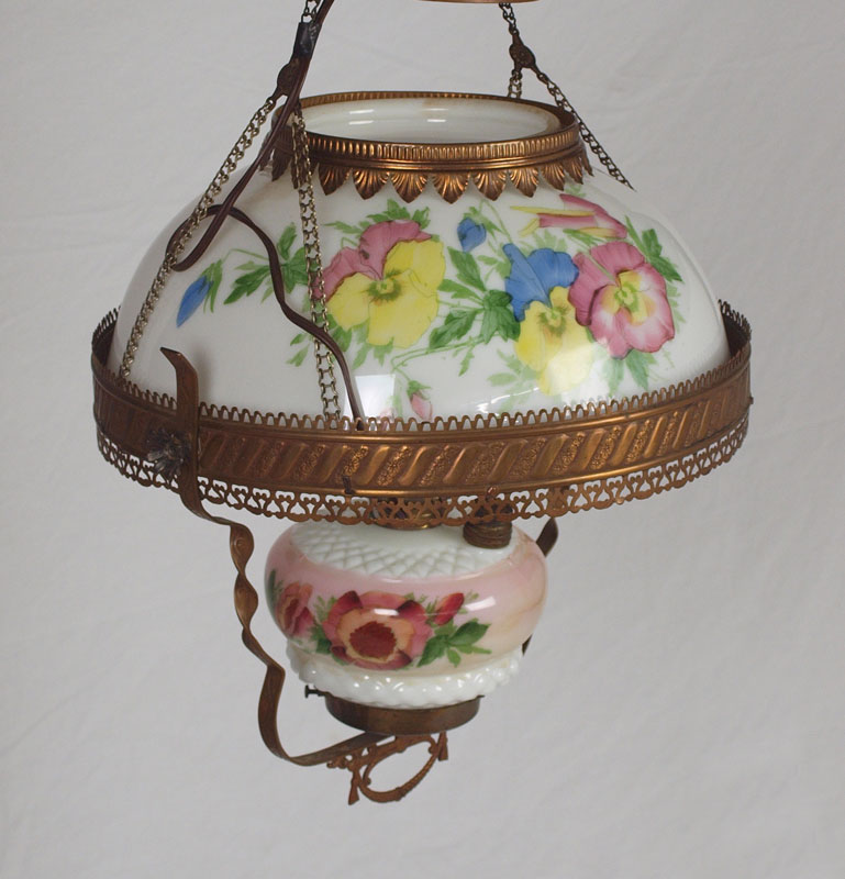 VICTORIAN HAND PAINTED HANGING LIGHT: Electrified. Hand painted glass shade in a pansy design. 25 1/2'' h. x 16''.