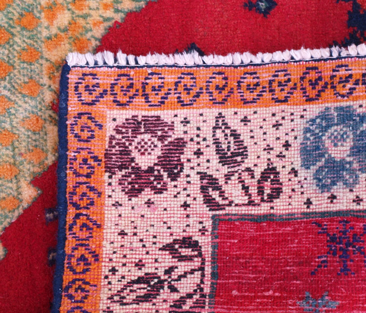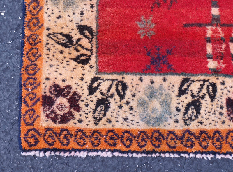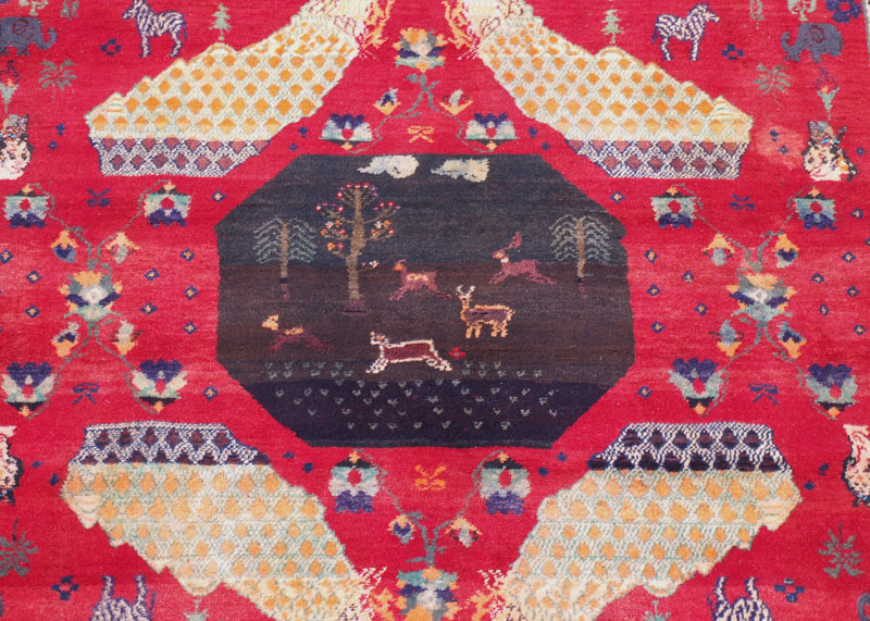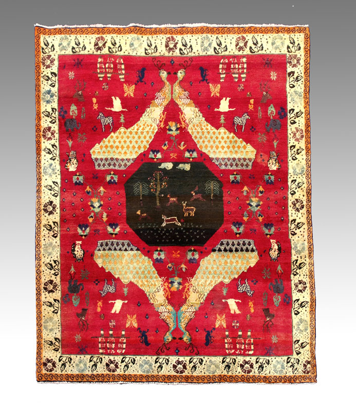 HAND TIED SHIRAZ RUG WITH CENTRAL FIGURAL SCENE: Approx. Scattered figures on ground. Approx. 7' 1'' x 5' 6''
