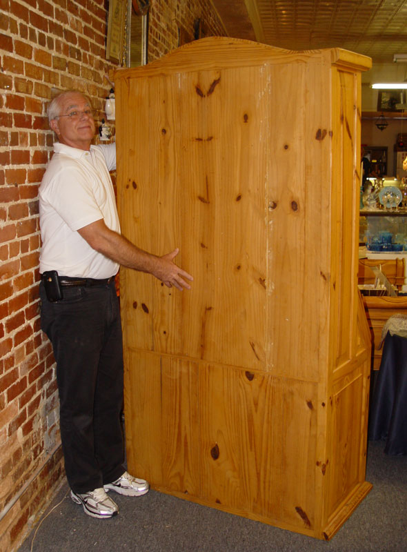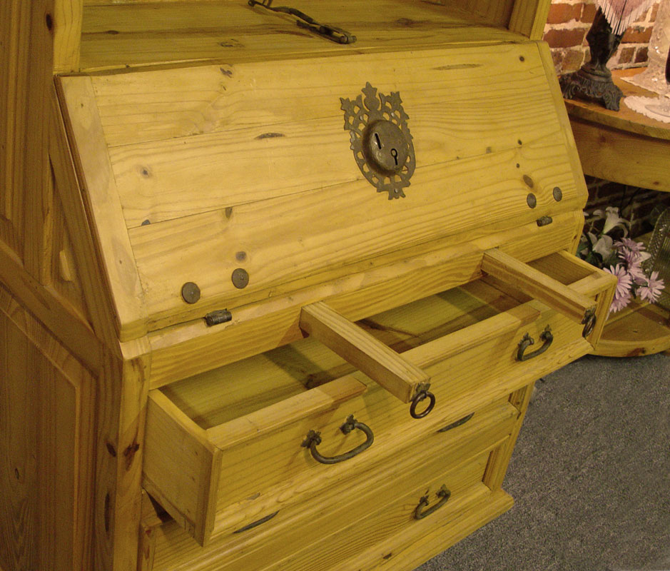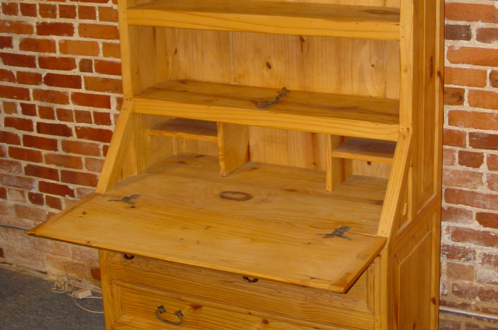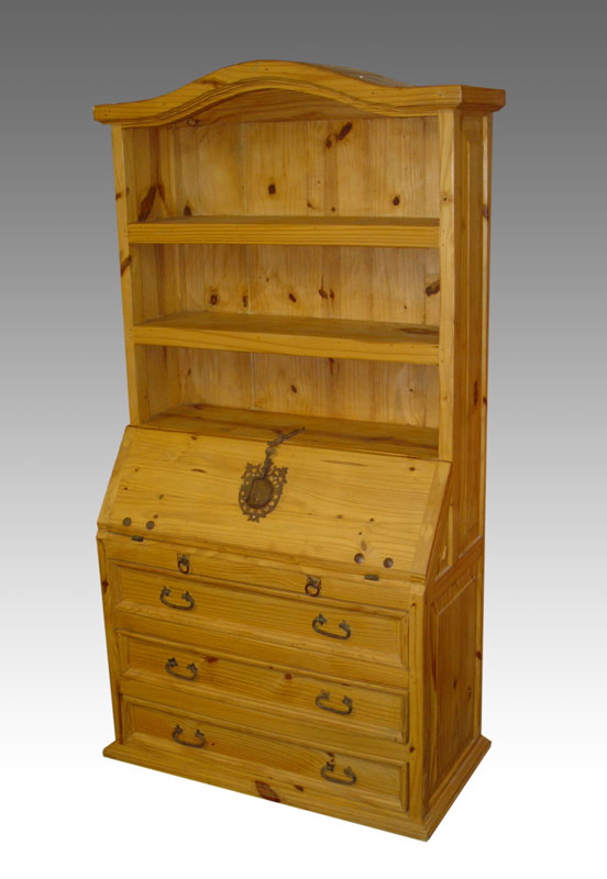 CUSTOM PINE MEXICAN STYLE DROP FRONT BOOKCASE DESK: Open top with 2 shelves dropfront desk with slide supports over 3 drawers. Iron hardware with elaborate iron lock and hinges. Finished with raised side panels. 78'' h. x 39'' x 20''.