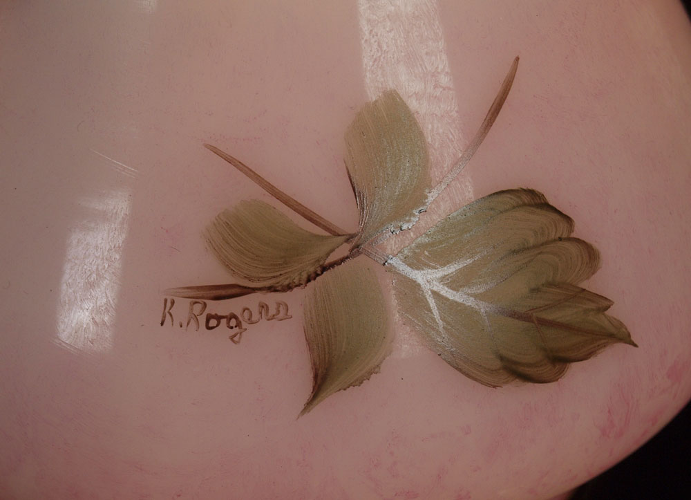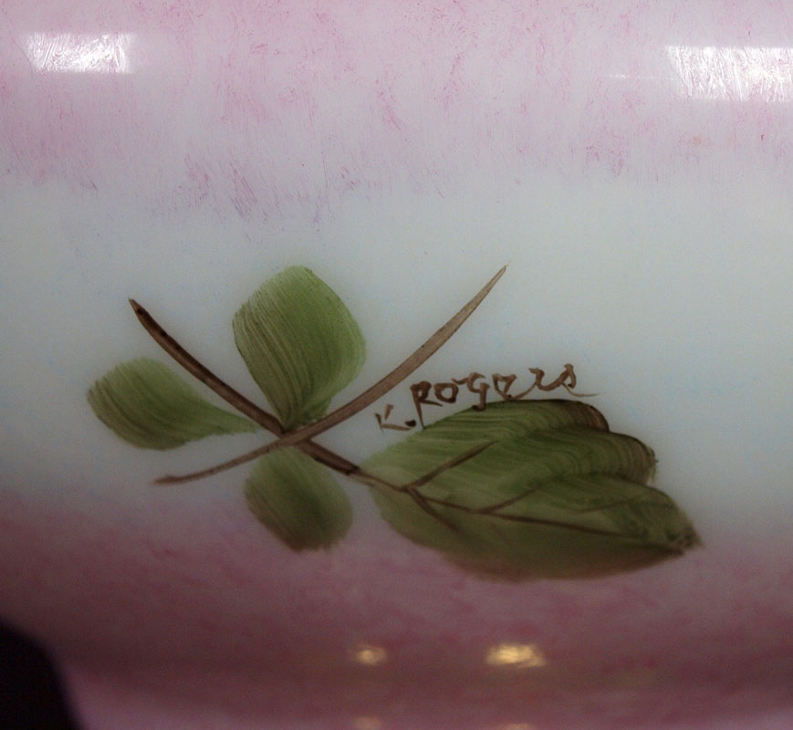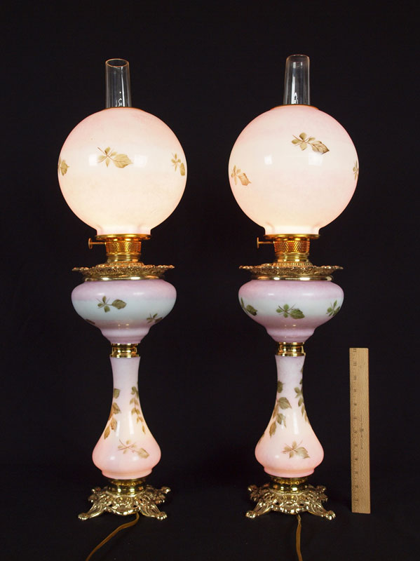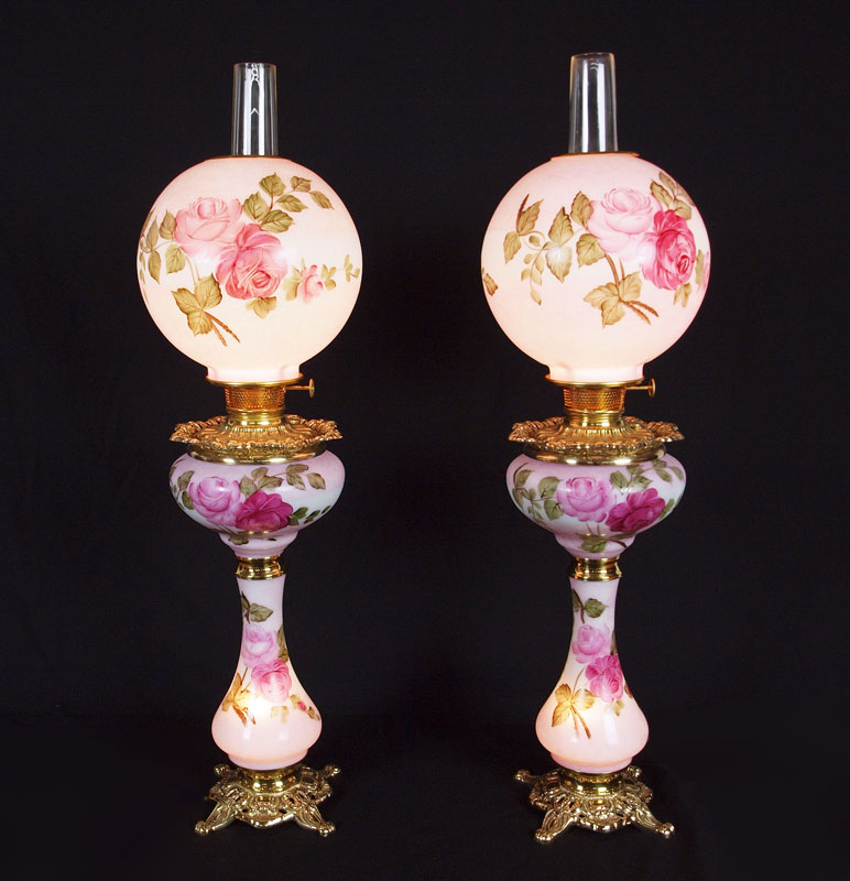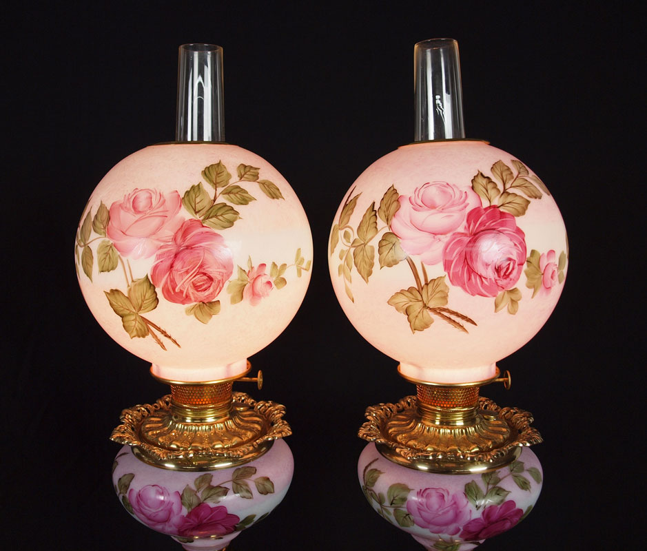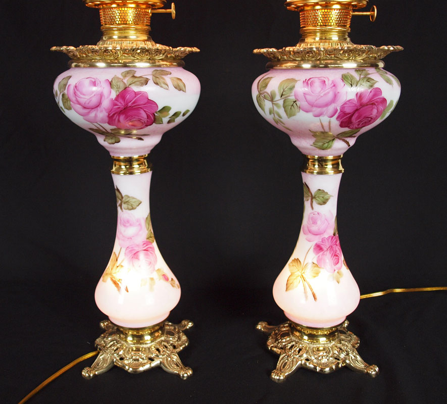 PAIR B & P HAND PAINTED BANQUET LAMPS: ''Queen Elizabeth'', three tier banquet lamps handpainted by American artists on US glass shade, font, and column. Brass mountings. Approx. 34'' tall.
