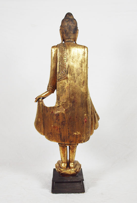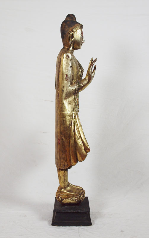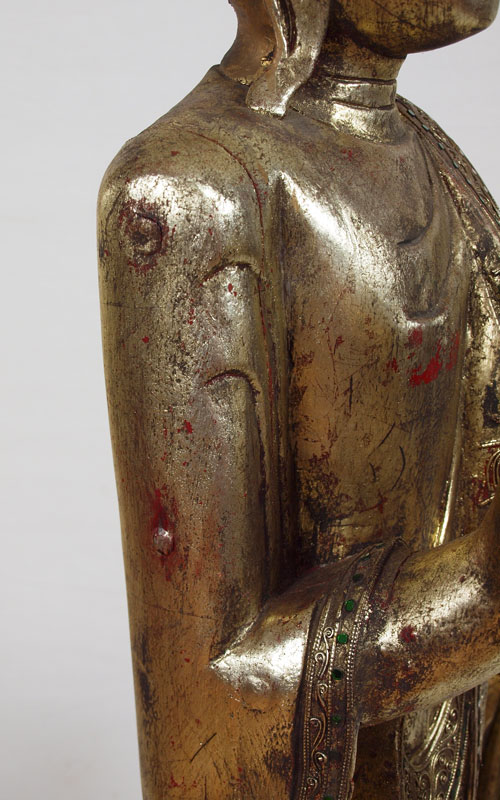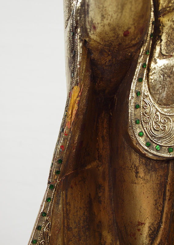 SILVER GILT CARVED WOOD BUDDHA: Embellished with mirror dots. Approx. 4.5 ft tall, overall.