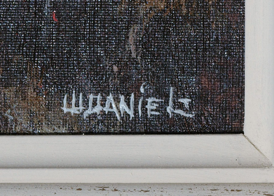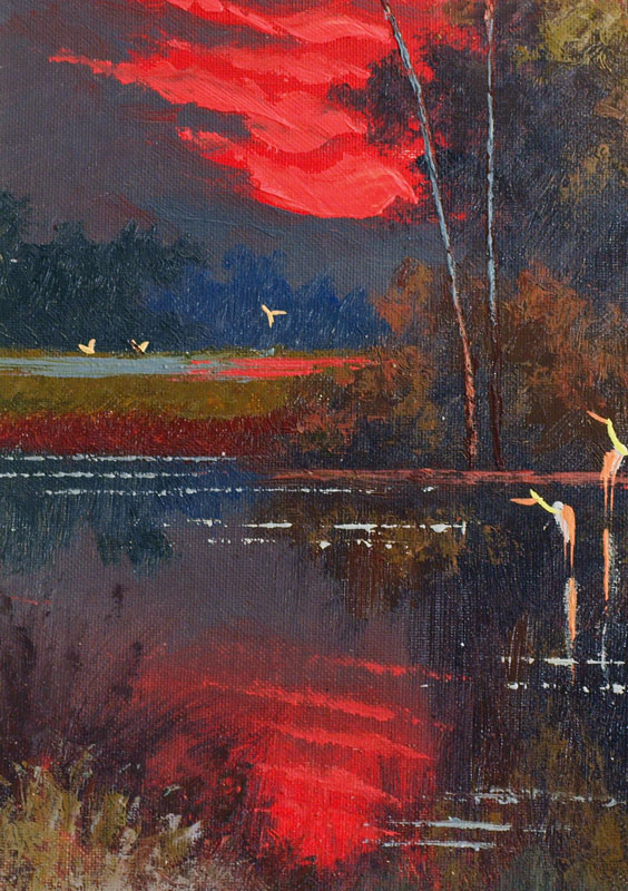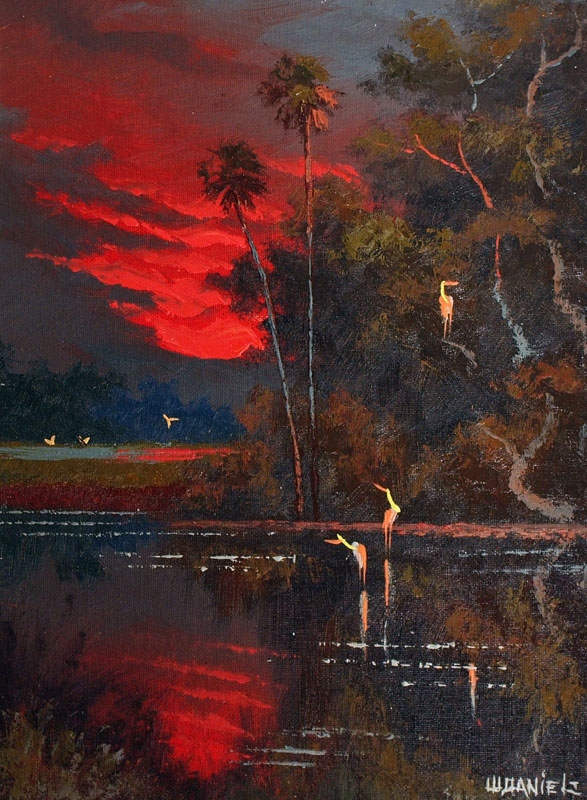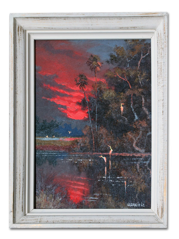 DANIELS, Willie, (American, 20th Century): Florida Highwaymen, ''Fire Sky Backwater'' with birds, OIL/Canvasboard, signed lower right, 16'' x 12'', framed 18 3/4'' x 14 3/4''.