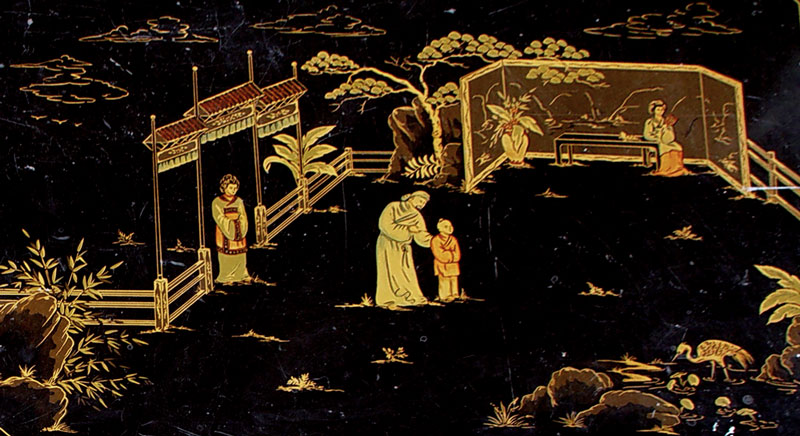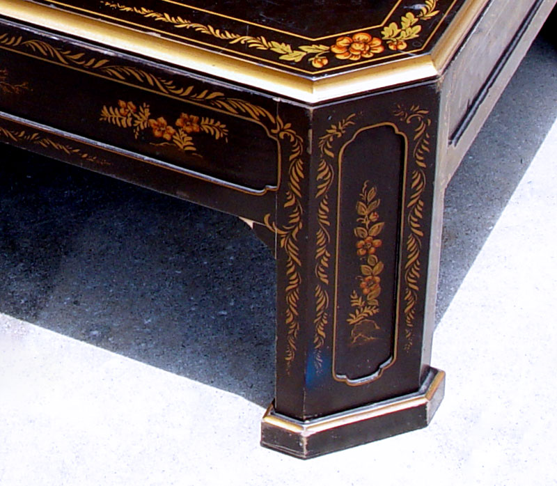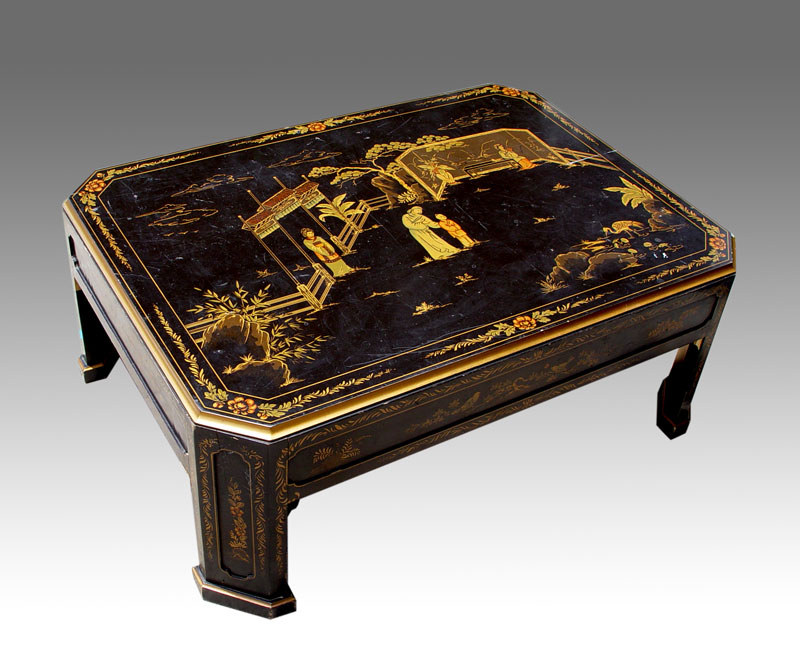 CONTEMPORARY BLACK LACQUER COFFEE TABLE: Black ground with gold trim and accents. Oriental figures, trees, animals and landscape. Square frame with cut corners and straight legs. 18'' h. x 47'' x 34''.