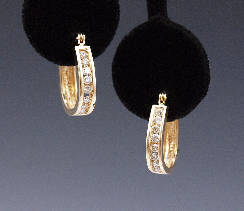 14K DIAMOND EARRINGS: 14K yellow gold hoop type earrings contain 16 round brilliant cut diamonds, approx. .50 Ct., rated SI in clarity and K-L-K in color. All diamonds are channel set. Weight: 4.6 grams. Sold with a current Florida Diamond Appraiser's GIA graduates appraisal for $775.00.