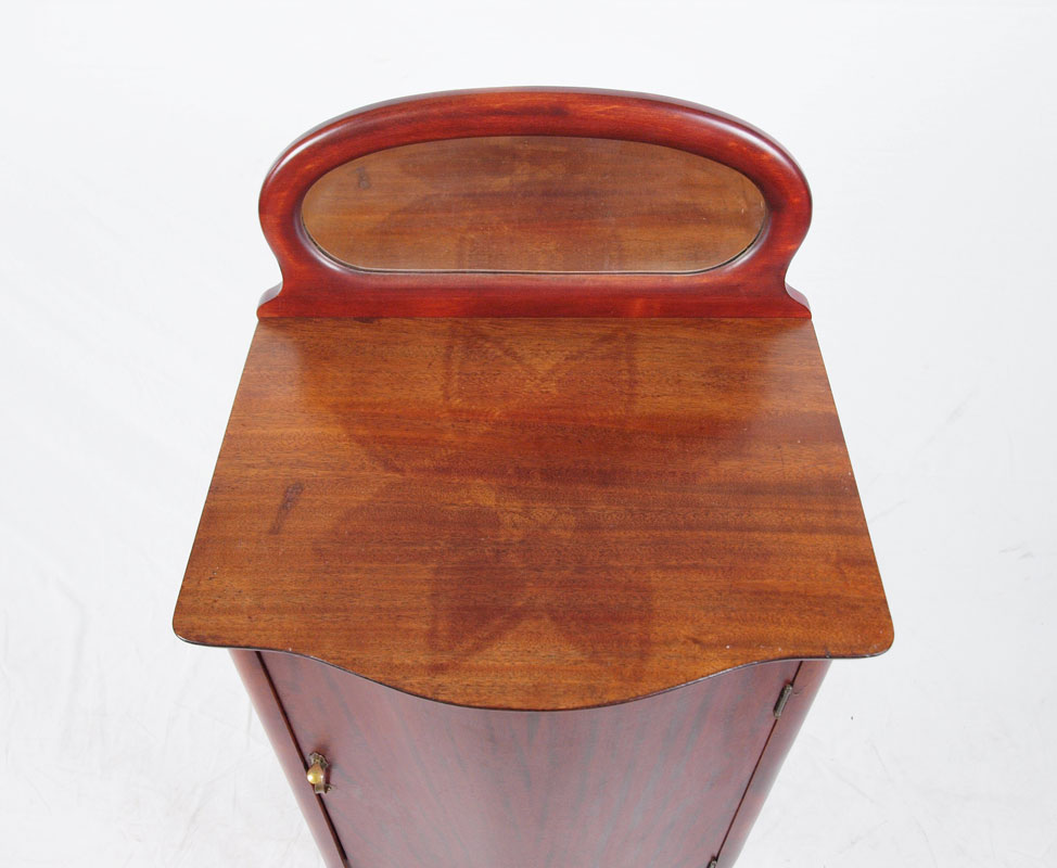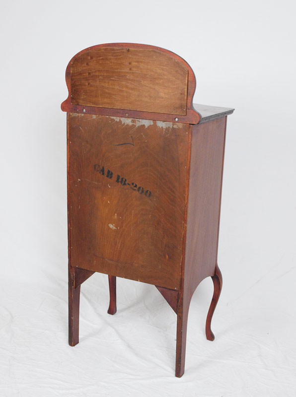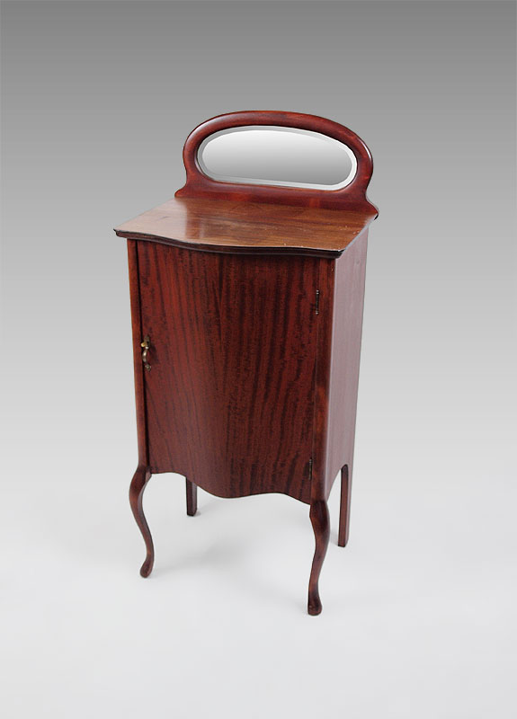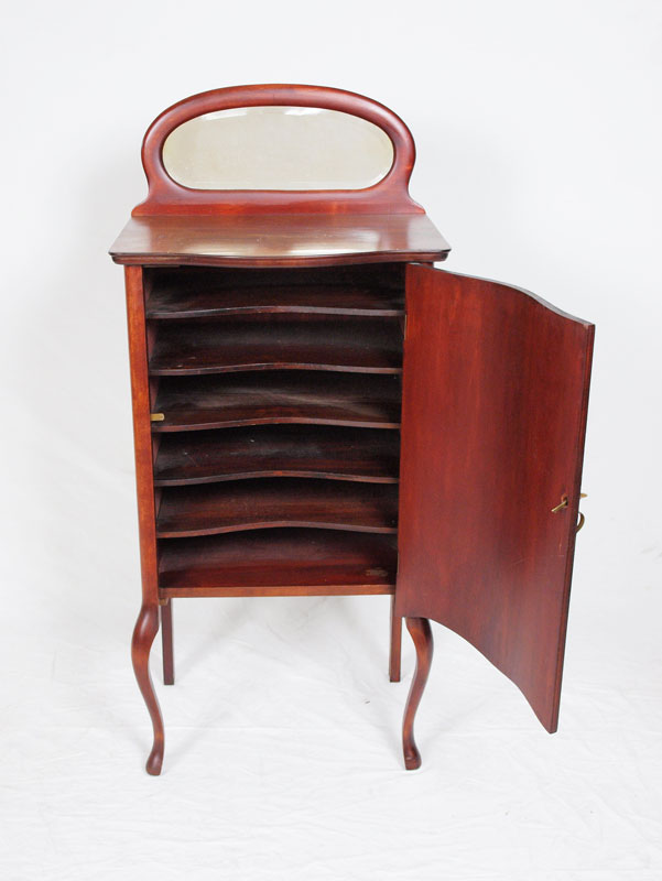 VICTORIAN MAHOGANY MUSIC STAND: Single door with adjustable shelf interior. Oval beveled mirror back on cabriolet legs. 44 1/2'' h. x 20'' x 16''.