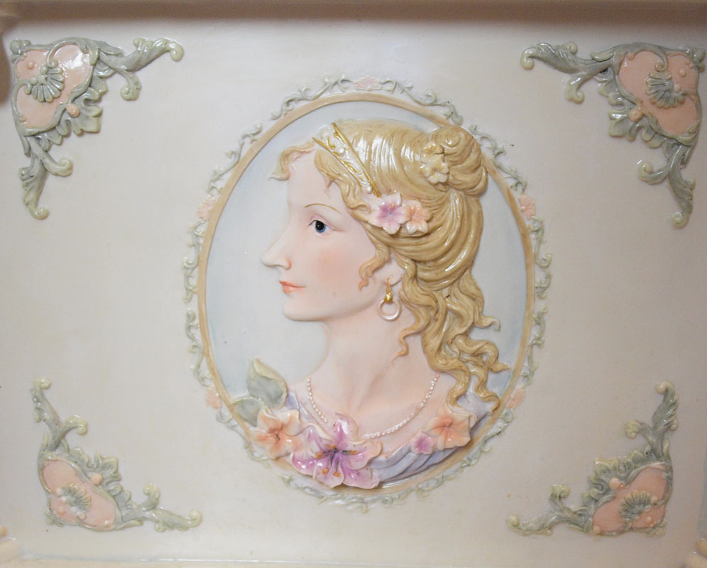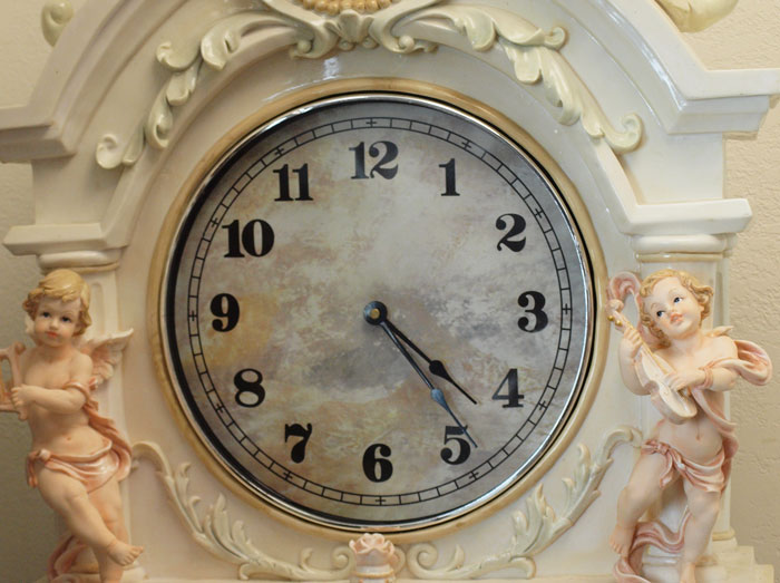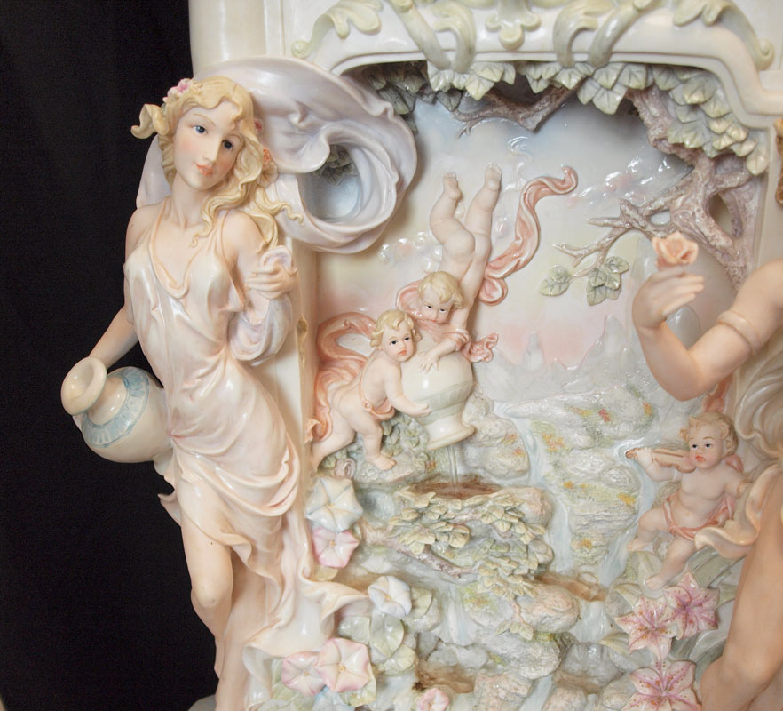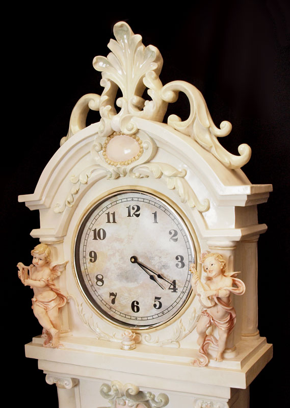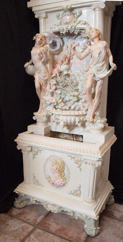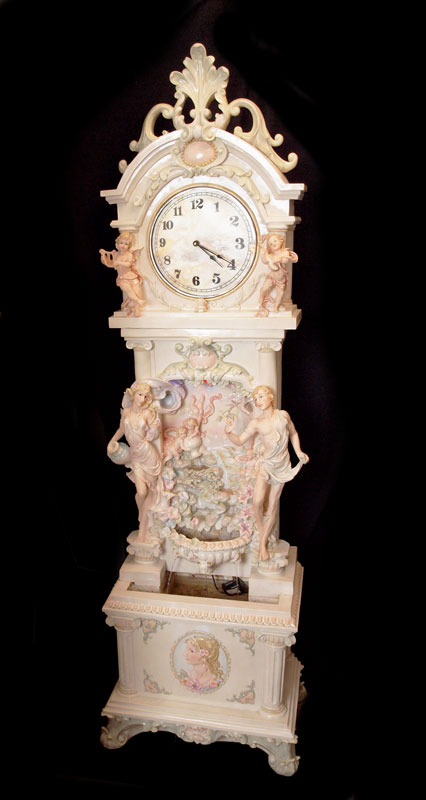 MOLDED ROCOCO GRANDFATHER WATERFALL CLOCK WITH CHERUBS: Molded resin or plastic grandfather clock featuring cherubs, Greek figures and stunning water feature with multi colored strobing lights. Electric quartz movement, lights battery powered. Measures approx. 81 1/2'' h. x 24 1/2'' x 16''.