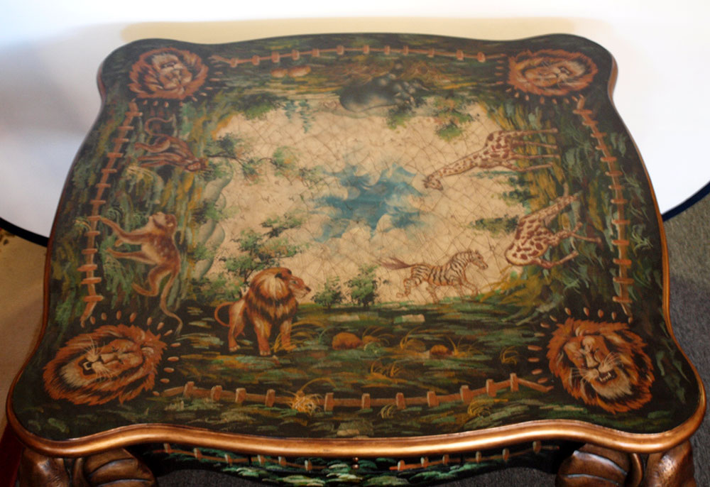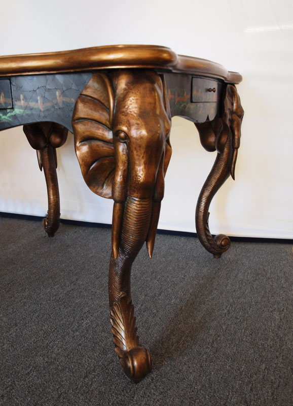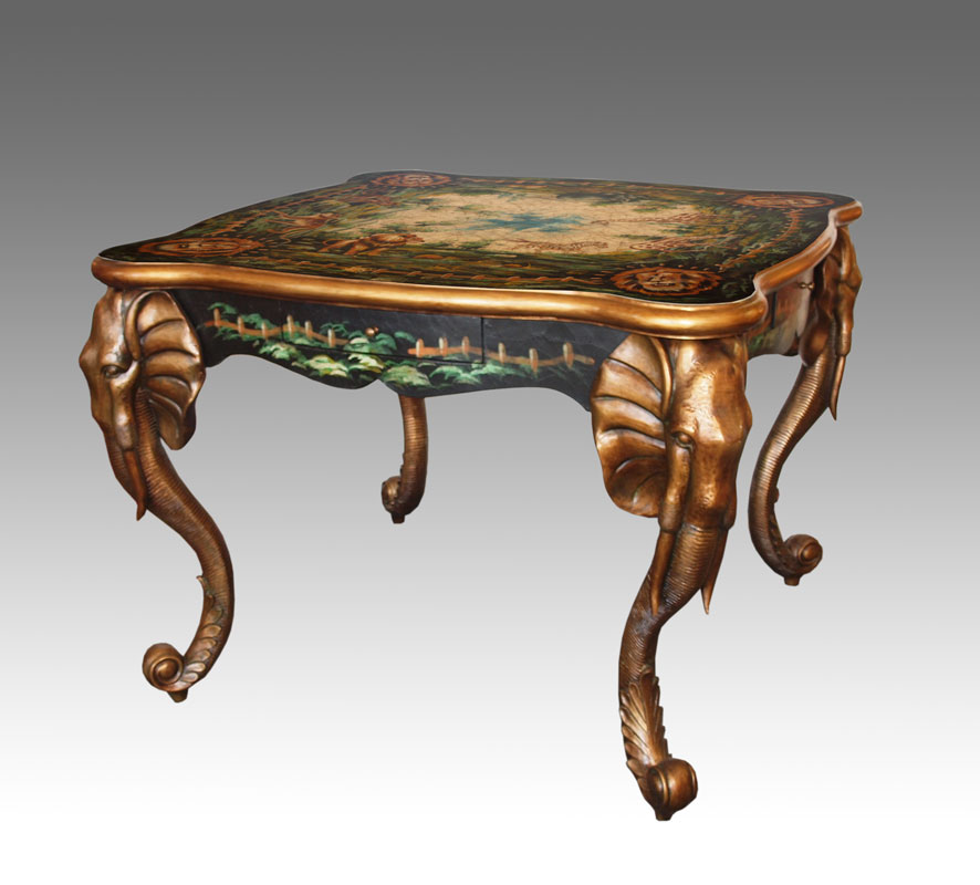 CONTEMPORARY PAINT DECORATED TABLE WITH ELEPHANT FORM LEGS: Single drawer on each side of shaped apron. 30'' h. x 39'' square.