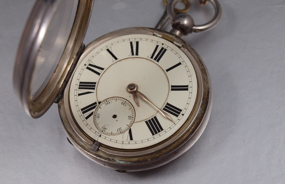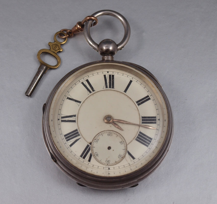 ENGLISH SILVER FUSEE POCKET WATCH WITH KEY CA. 1880'S: Silver case with British hallmarks, tests to sterling. To service the movement the case opens from the front and the movement hinges out. Key wind and key set mechanism. About the size of American 16. Crystal in good condition. Double sunk dial with Roman Numerals. Missing part of the hour hand, and the second hand. Not running.