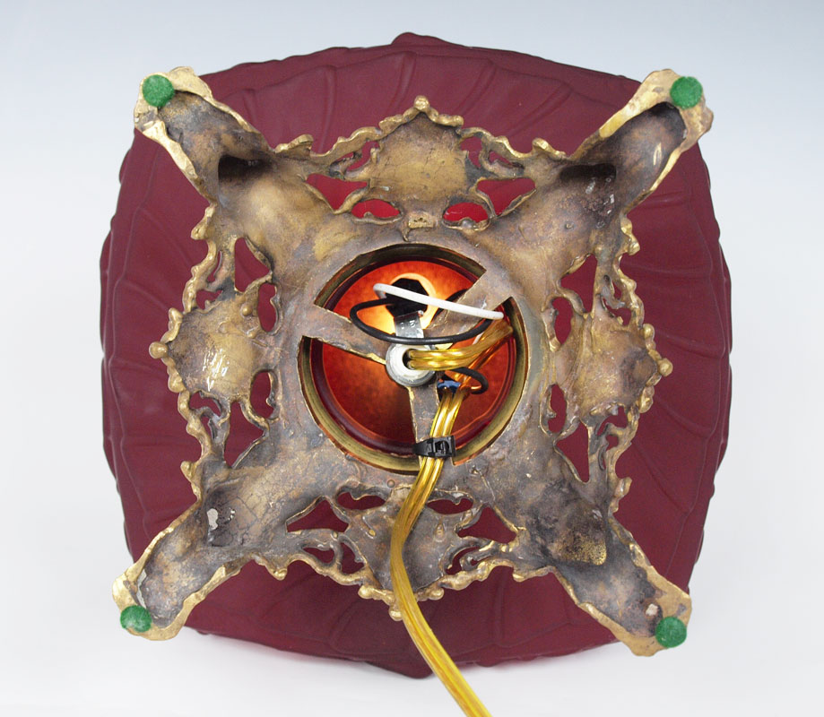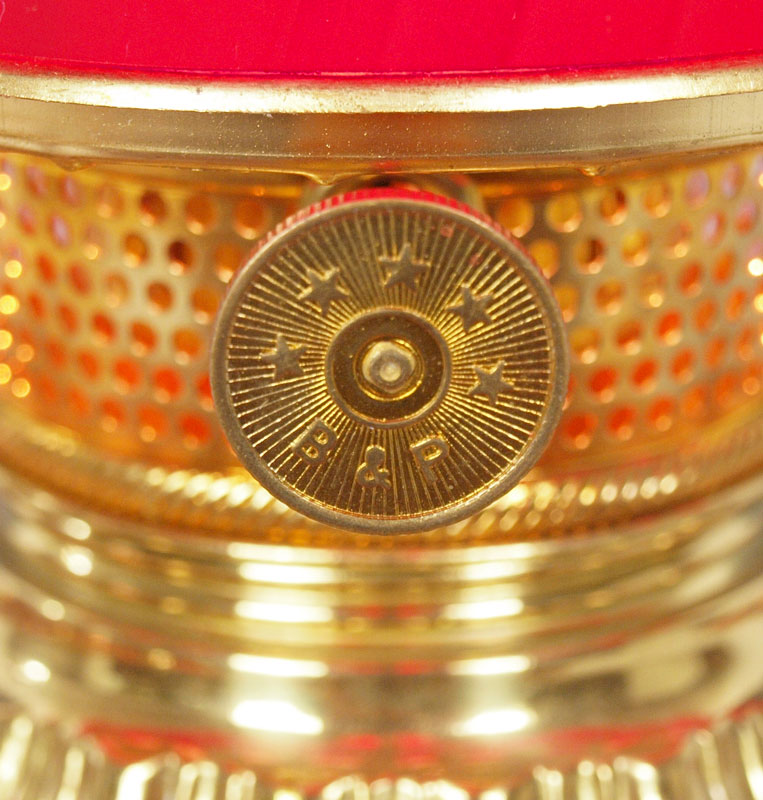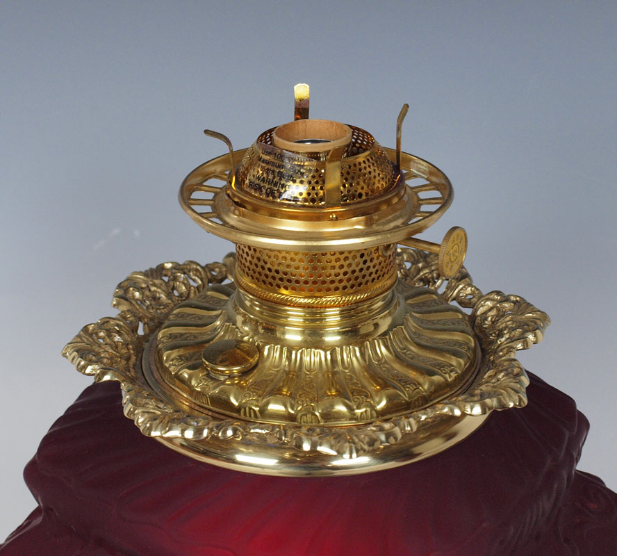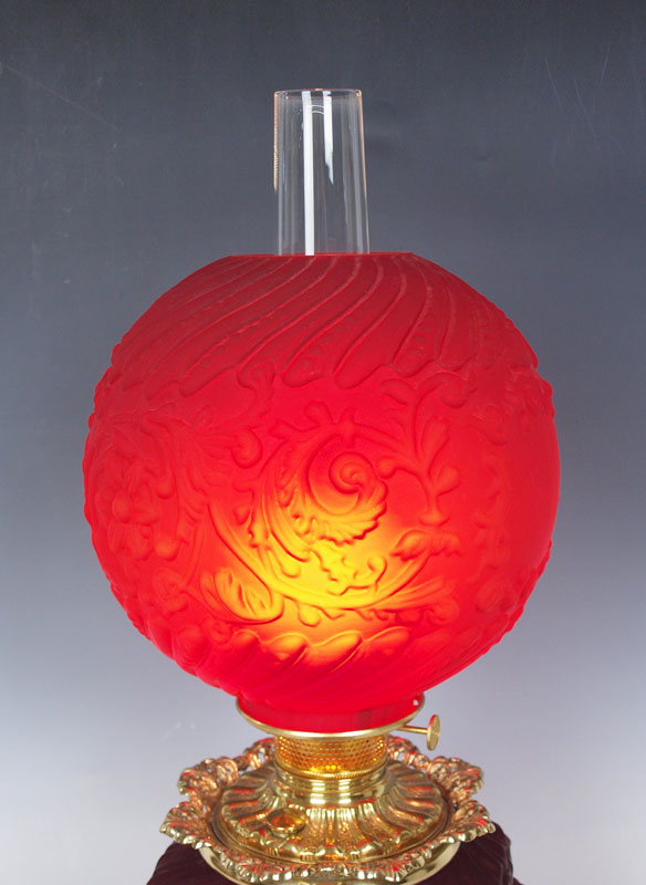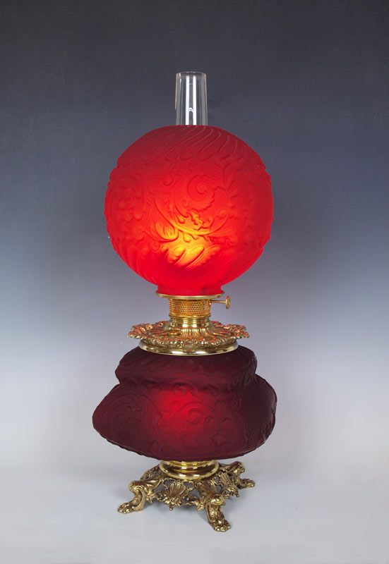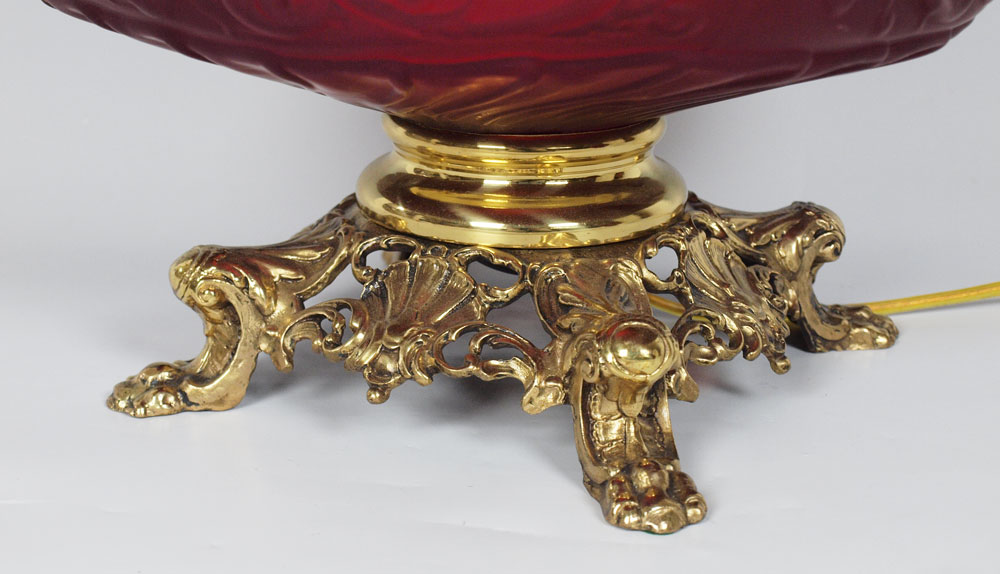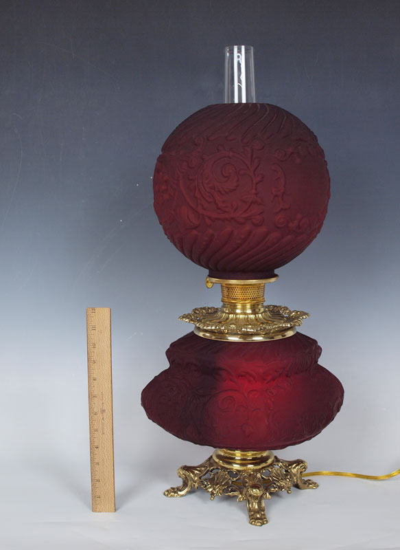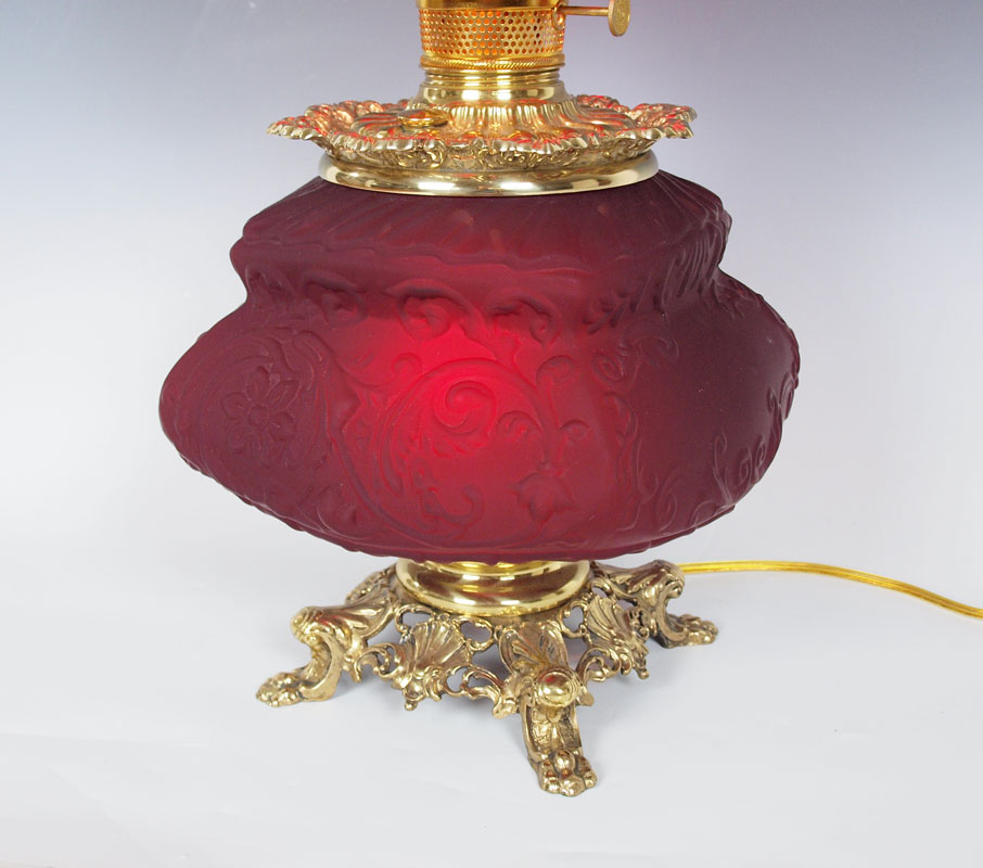 B & P VICTORIAN STYLE RED SATIN GLASS GONE WITH THE WIND LAMP: Manufactured by hand using the original molds. Ornate brass mounts, embossed base and shade. Approx. 25'' tall overall.