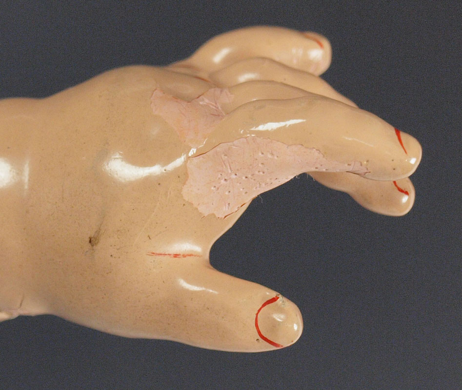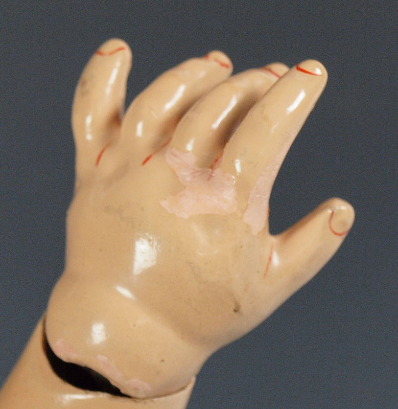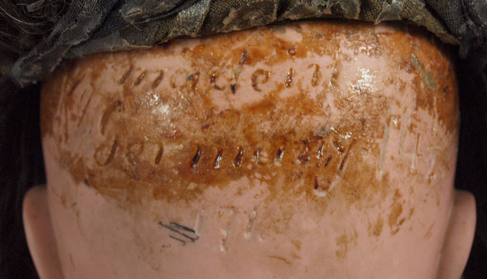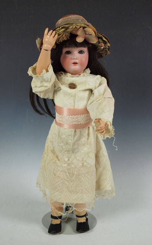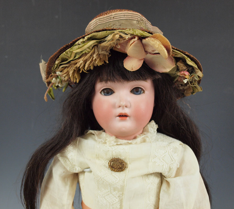 KESTNER GERMAN BISQUE DOLL 171, CA. 1900: Bisque head with sleeping blue glass eyes with lashes, open mouth with teeth, long dark hair, dressed in the appropriate Victorian clothes of the day, with fancy hat. Approx. 26'' tall.