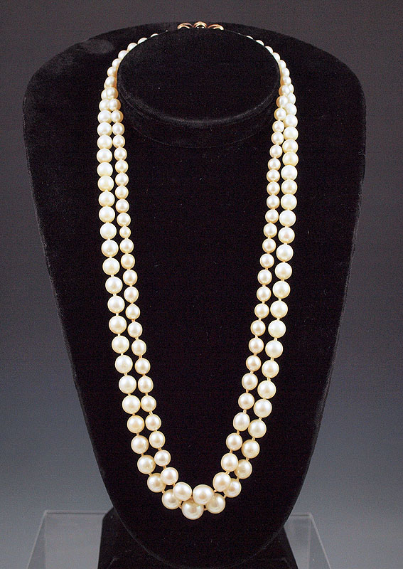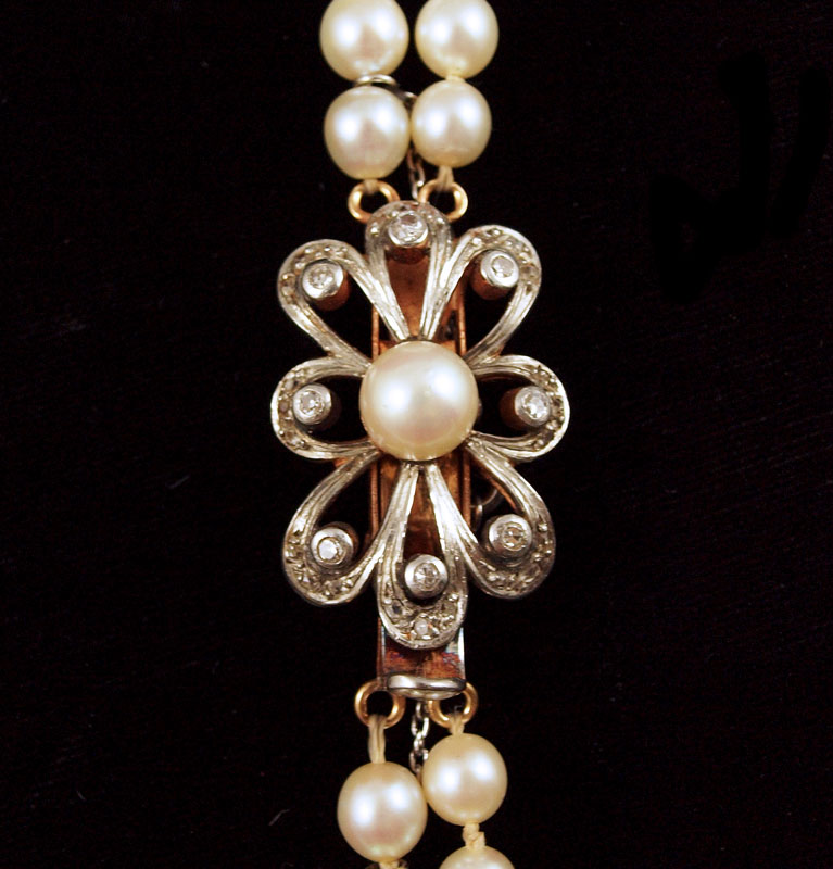 14K PEARL & DIAMOND CLASP DOUBLE STRAND NECKLACE: Double strand graduated cultured pearl necklace. 5.50 - 9.50 mm, dark cream, very blemished, low luster. 14K clasp contains 32 single cut and rose cut diamonds. Weight: .25 Ct. Approx. Length: 22''